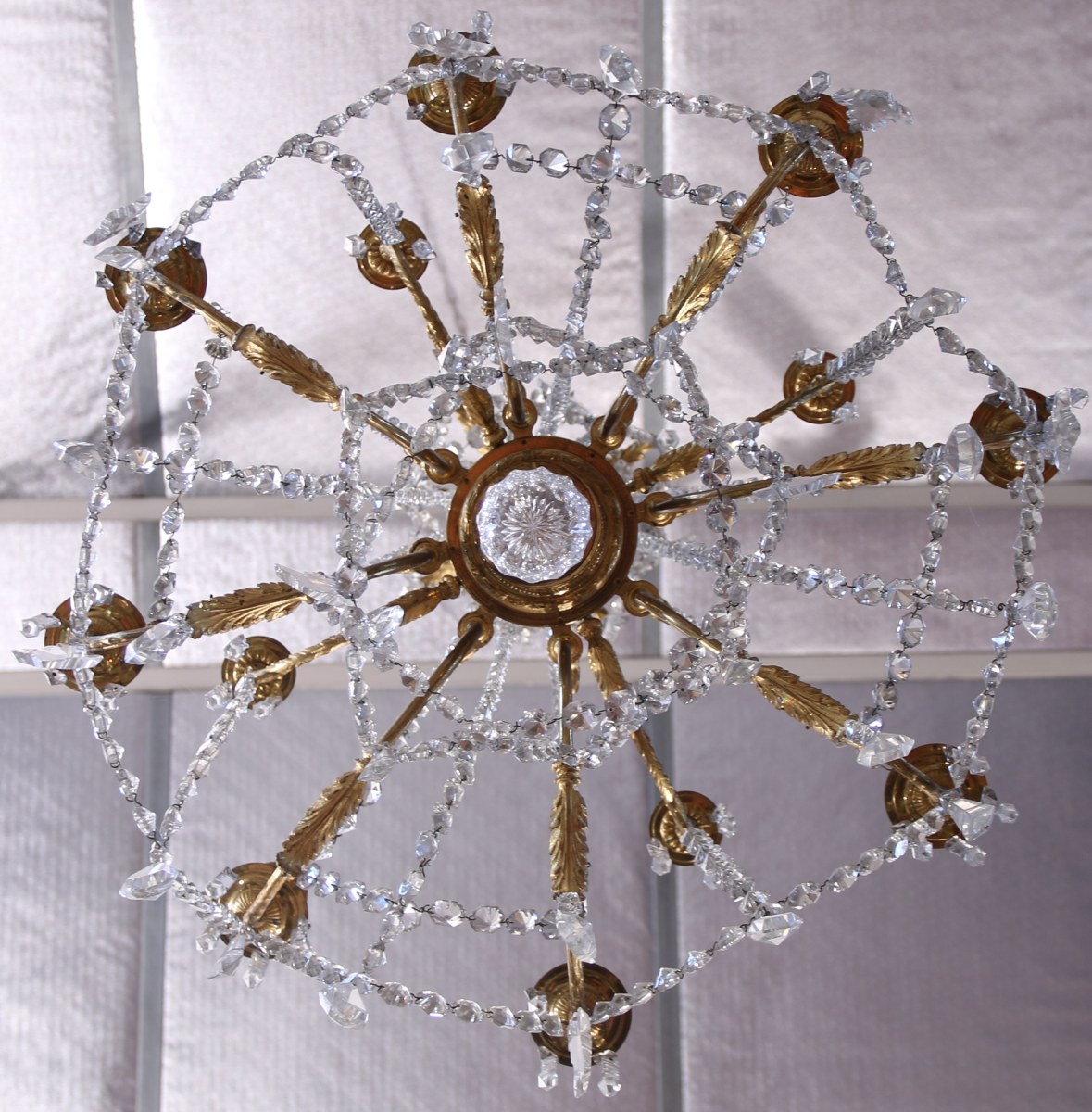 LUSTRE en bronze ciselé et doré à douze bras de lumière feuillagés répartis sur deux niveaux dont huit retenus par des têtes d'aigles. Les binets sont ornés de feuilles d'eau. Le fût central cannelé reçoit une riche ornementation en cristal taillé, telles que guirlandes de fleurs, acanthes et perles, pampilles, larmes. Amortissement d'une boule en cristal soutenue par une pomme de pin.