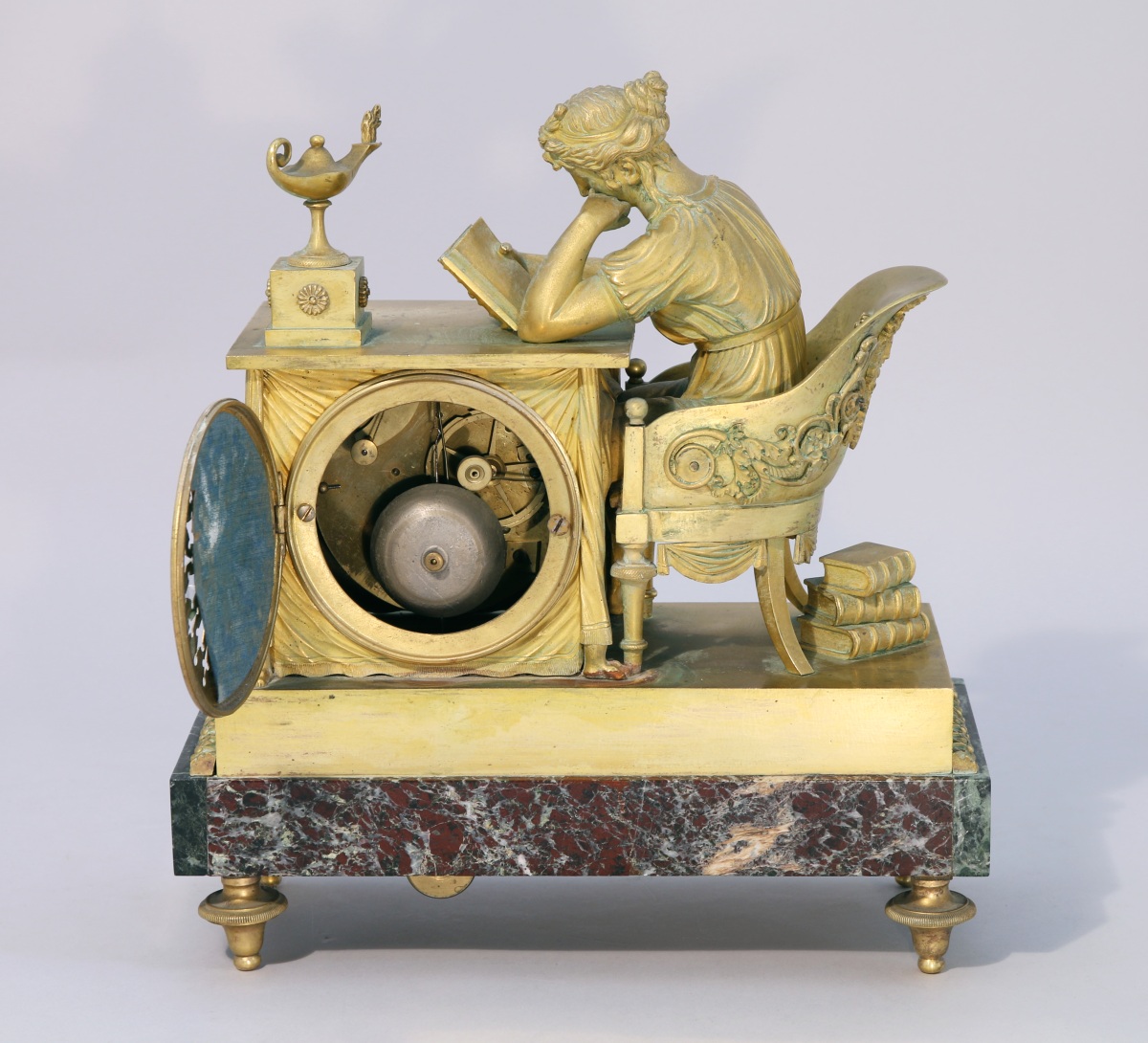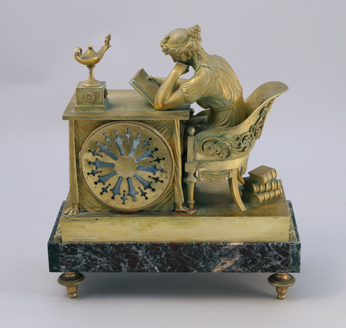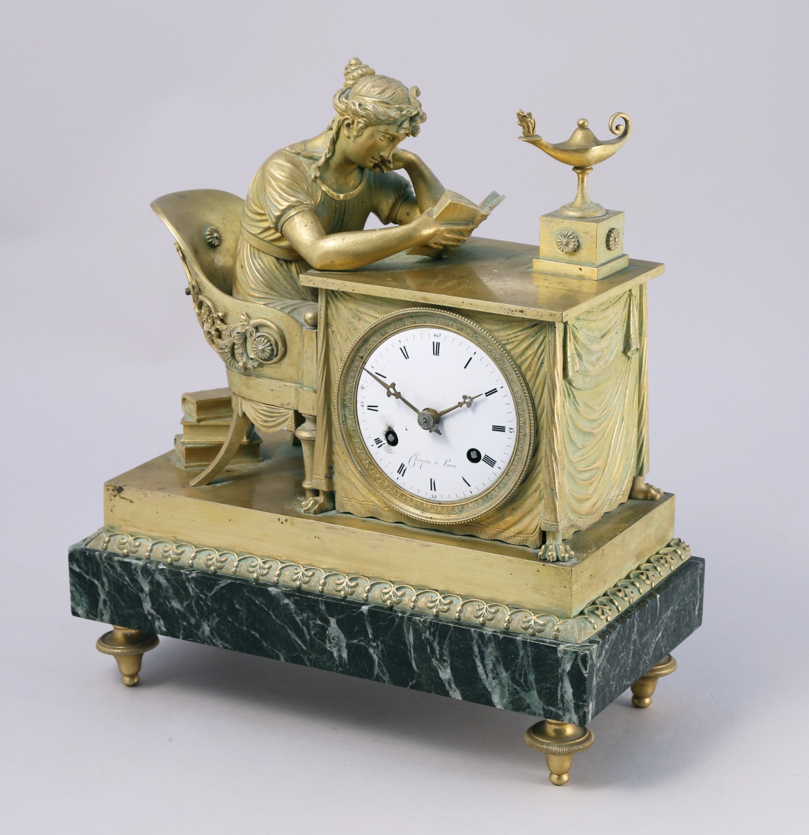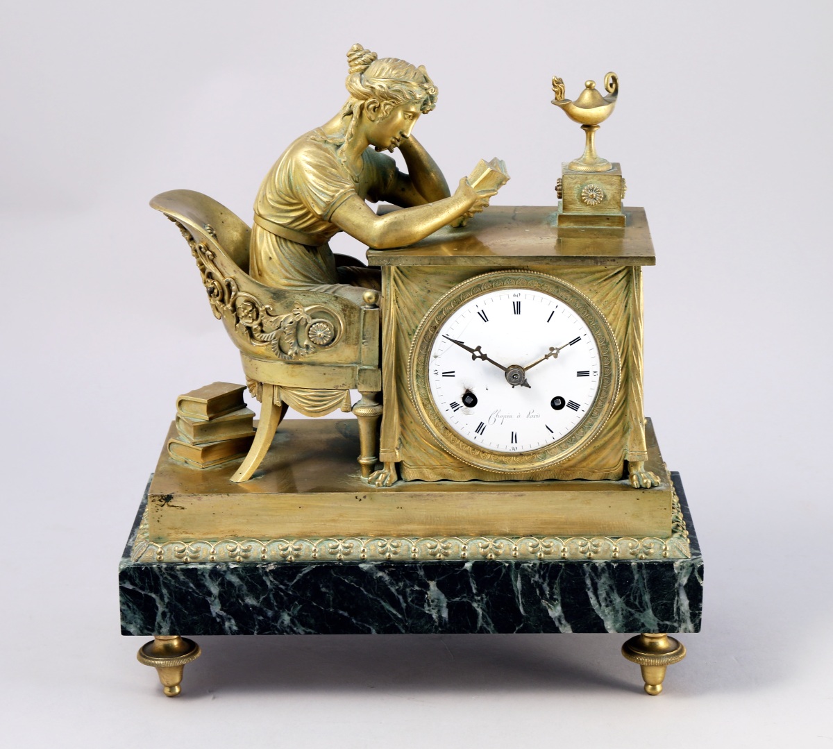 de forme rectangulaire figurant une jeune femme à l'antique lisant un livre. Elle est assise sur un fauteuil à dossier en gondole enveloppant appliqué de rinceaux et d'un masque d'apollon à palmettes. Elle est penchée sur une table drapée à griffes de lion sur laquelle brûle une lampe à pétrole. Le cadran de forme ronde s'incrit dans la draperie. Émaillé blanc, il indique les heures en chiffres romains et est signé "Chopin à Paris". Base de forme rectangulaire appliquée de marbre vert de mer agrémentée en dessus d'une frise de palmettes. Elle repose sur quatre pieds toupie.