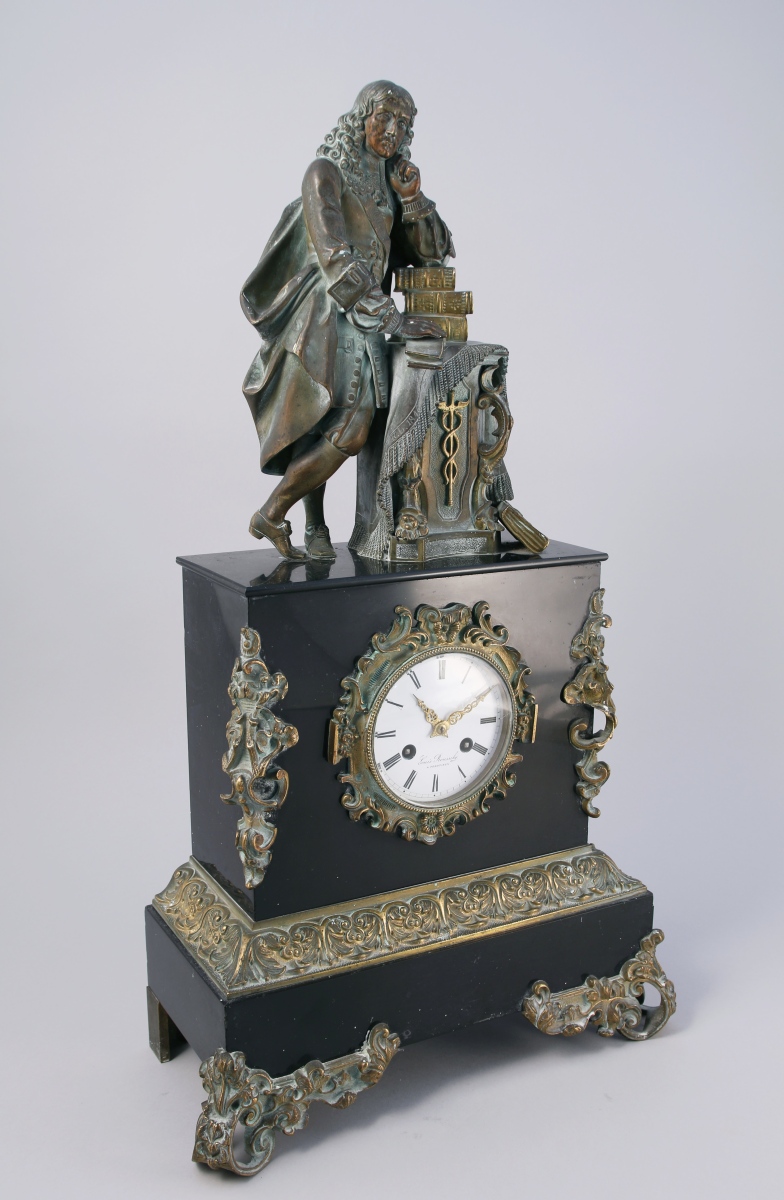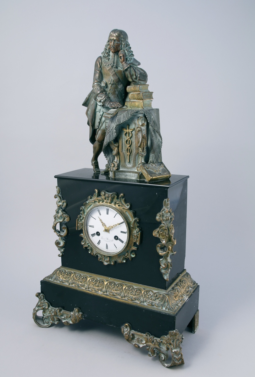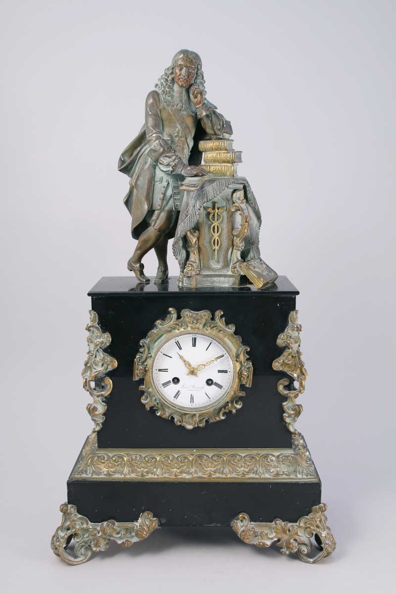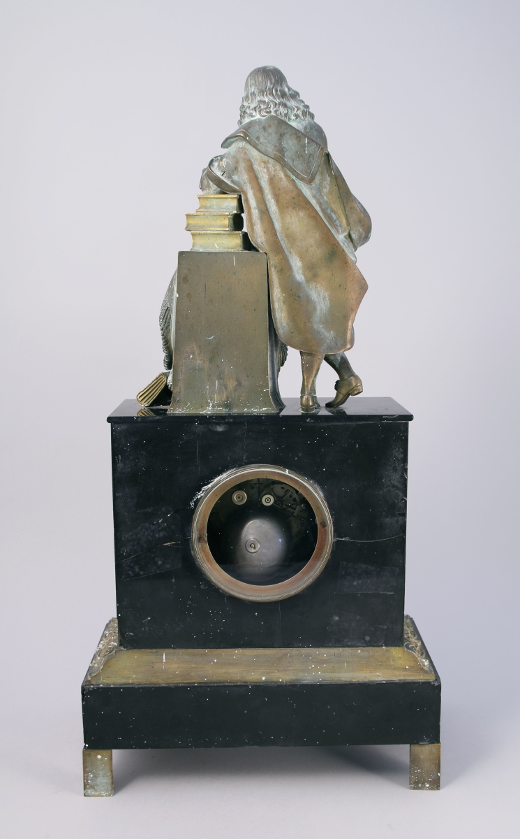 figurant probablement Antoine Vallot (1594-1671), premier médecin de Louis XIV. Il se tient debout accoudé sur une pile de livres posés sur un tapis jeté sur une borne ornée de cornes d'abondance. Socle de forme rectangulaire dans lequel s'inscrit le cadran de forme ronde émaillé blanc indiquant les heures en chiffres romains signé "Louis Roussely / à Périgueux". Bordure, écoinçons et frise feuillagés en bronze ciselé et doré. Base rectangulaire reposant sur deux pieds antérieurs feuillagés à enroulements et et pieds arrières droits.