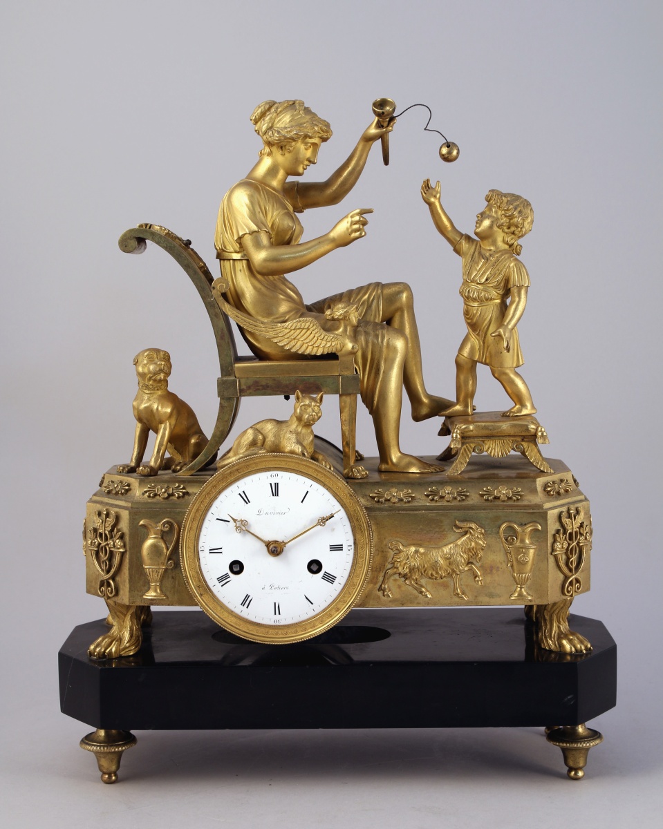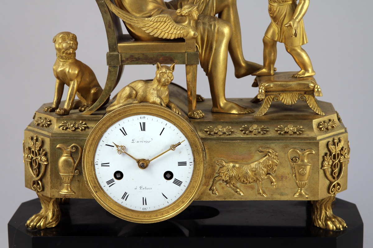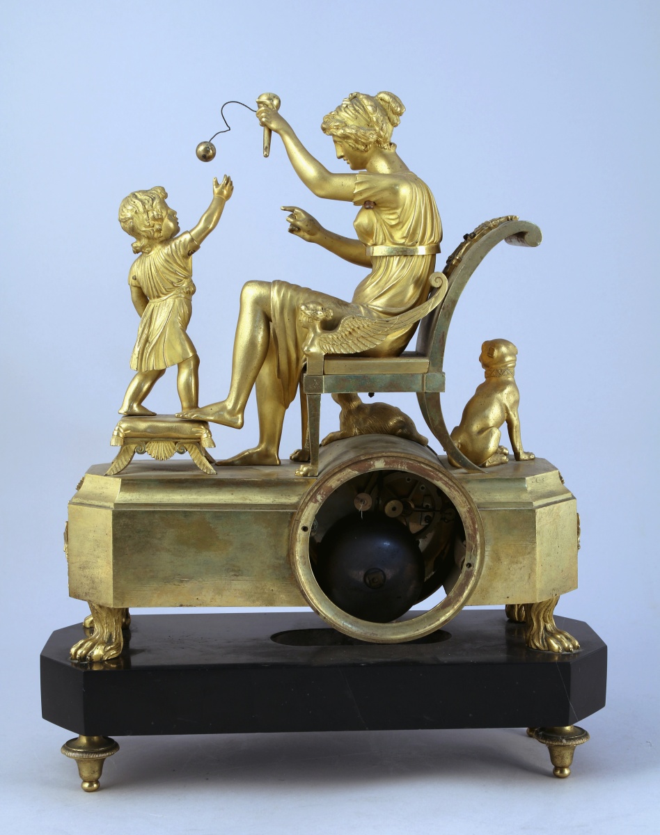 figurant une mère et son enfant jouant au bilboquet. Un chien se tient derrière la chaise sur laquelle la mère est assise, tandis qu'un chat est couché au-dessus du cadran. Ce dernier, excentré, est émaillé blanc. Il indique les heures en chiffres romains et est signé "Duvivier / à Potiers". Base de forme rectangulaire à pans coupés appliquée de têtes de mercure, caducées, aiguières et chèvre reposant sur quatre pieds griffe. Socle en marbre noir à piètement quadripode.