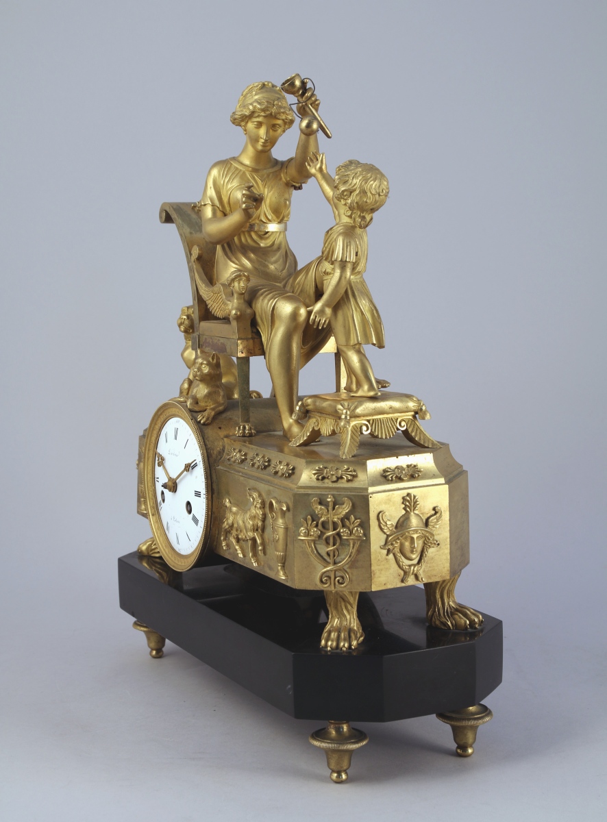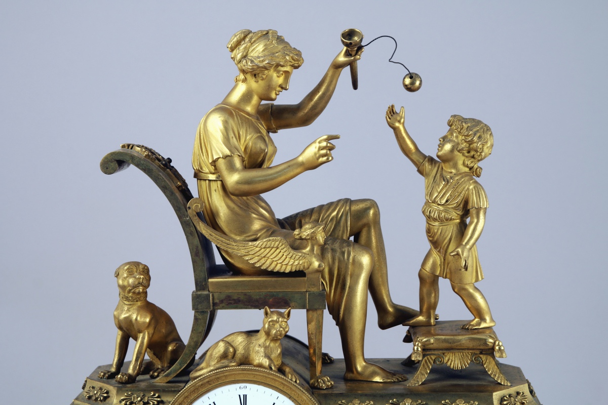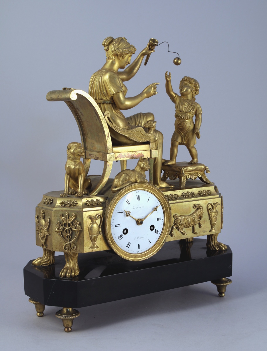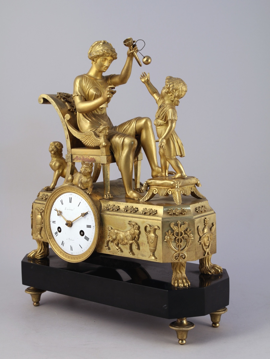 figurant une mère et son enfant jouant au bilboquet. Un chien se tient derrière la chaise sur laquelle la mère est assise, tandis qu'un chat est couché au-dessus du cadran. Ce dernier, excentré, est émaillé blanc. Il indique les heures en chiffres romains et est signé "Duvivier / à Potiers". Base de forme rectangulaire à pans coupés appliquée de têtes de mercure, caducées, aiguières et chèvre reposant sur quatre pieds griffe. Socle en marbre noir à piètement quadripode.