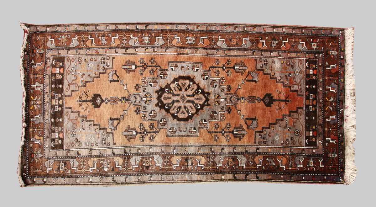 TAPIS, probablement CAUCASE, en laine à fond orangé à décor floral stylisé centré d'un médaillon. Bordure à fond brun à motifs géométriques.