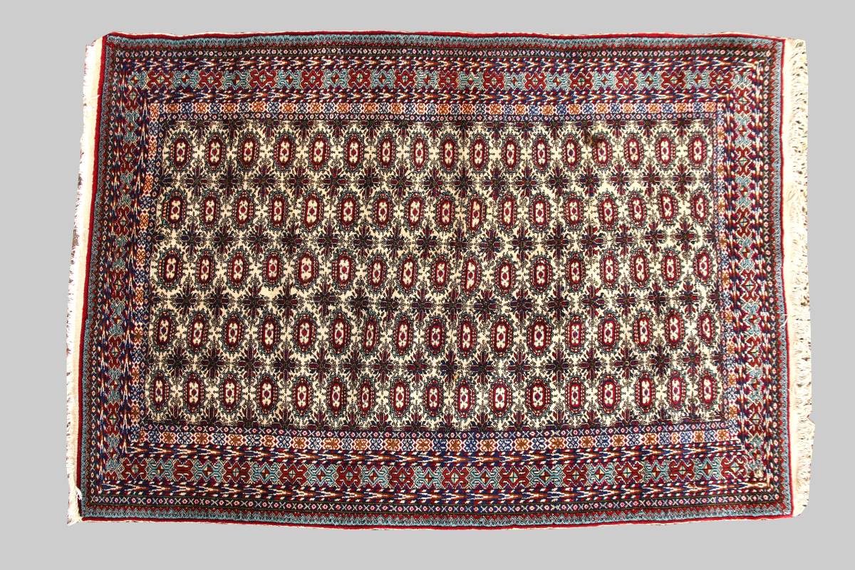 TAPIS d'ORIENT en laine à fond crème à décor floral stylisé. Bordure et contre-bordure à motifs géométriques.