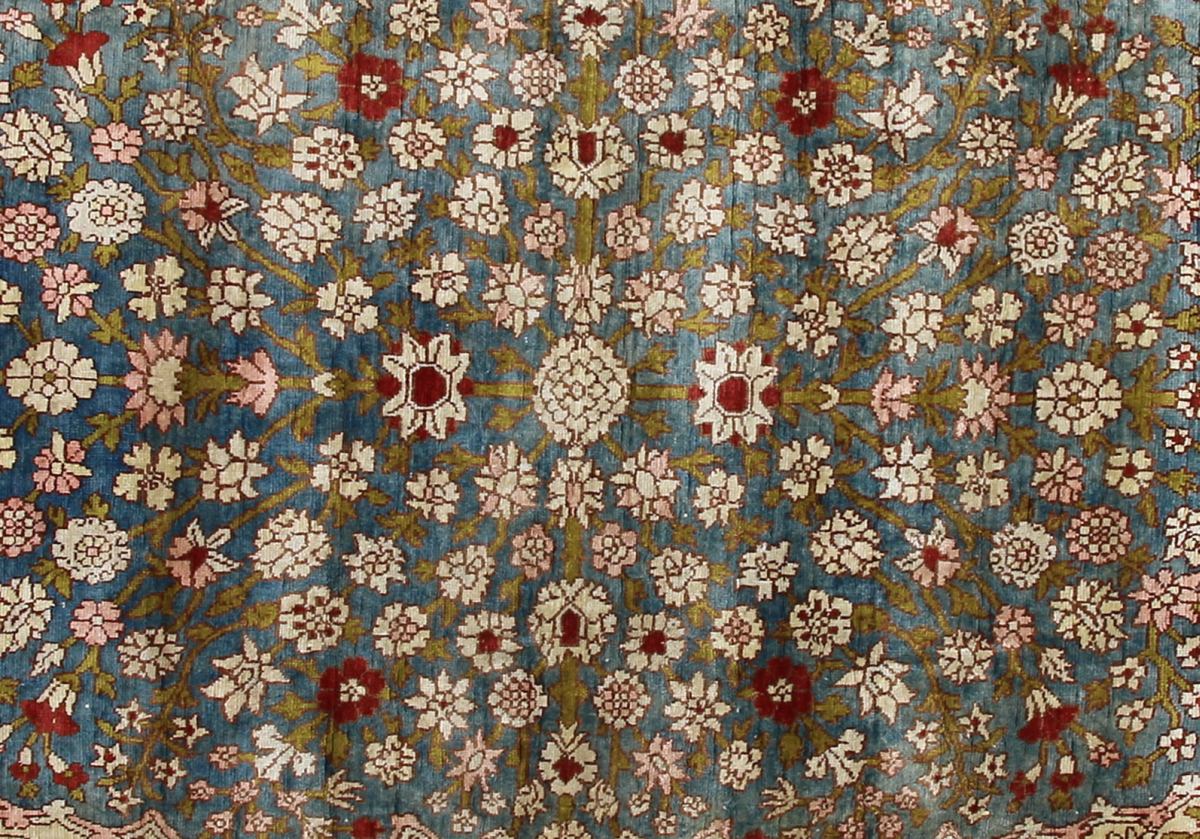TAPIS HEREKE en soie à fond beige à riche décor floral stylisé centré d'un cartouche contourné à fond bleu. Bordure rouge à contre-bordures beiges.