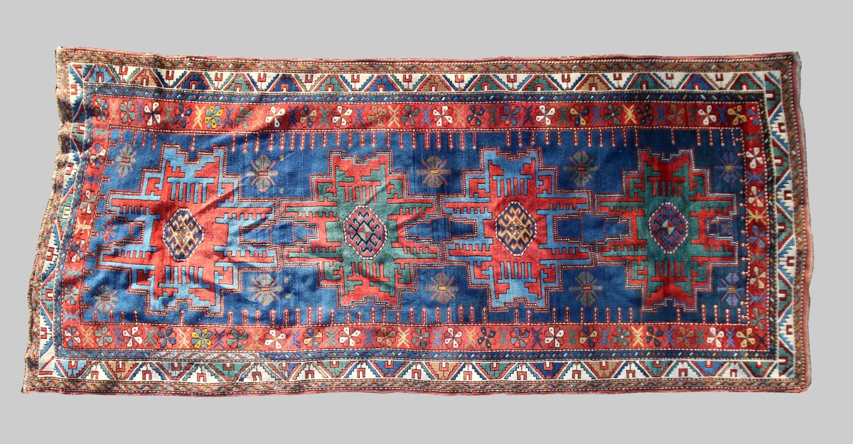 KAZAKH, GALERIE en laine a fond bleu et bordures rouges, aux quatre médaillons centraux aux motifs d'aigles stylisés.