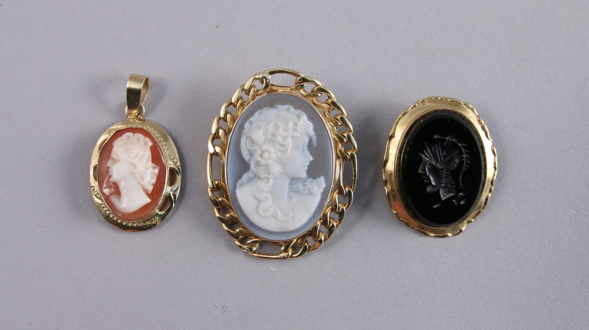 RÉUNION de DEUX CAMÉES et d'une INTAILLE de forme ovale, monture en or jaune 18K: