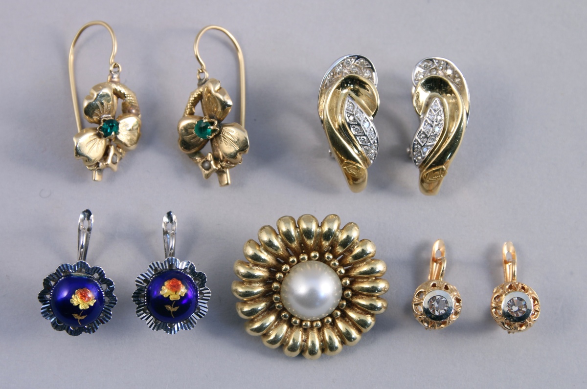 RÉUNION de QUATRE PAIRES DE BOUCLES D'OREILLE en or jaune et gris 18K: trois serties de pierres blanches ou vertes et une émaillée.