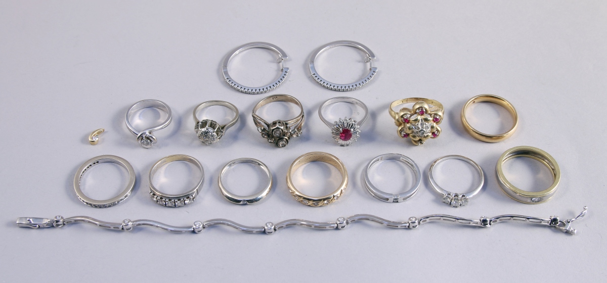 RÉUNION de 16 BIJOUX en or gris ou jaune 18K sertis de petits DIAMANTS: 9 bagues, 4 alliances, une paire d'anneaux d'oreille, un petit pendentif et un bracelet.