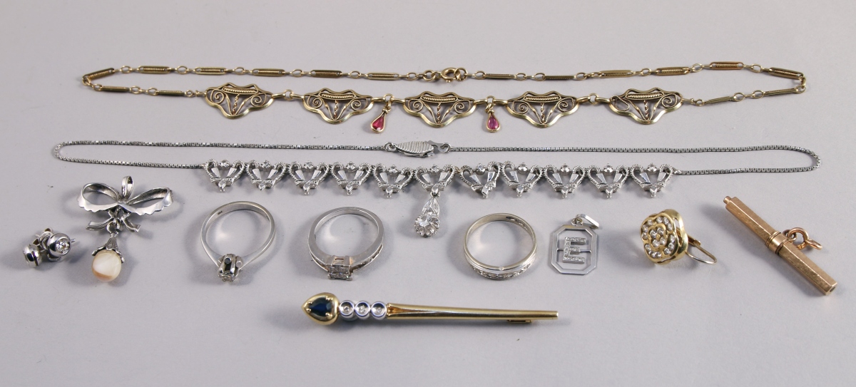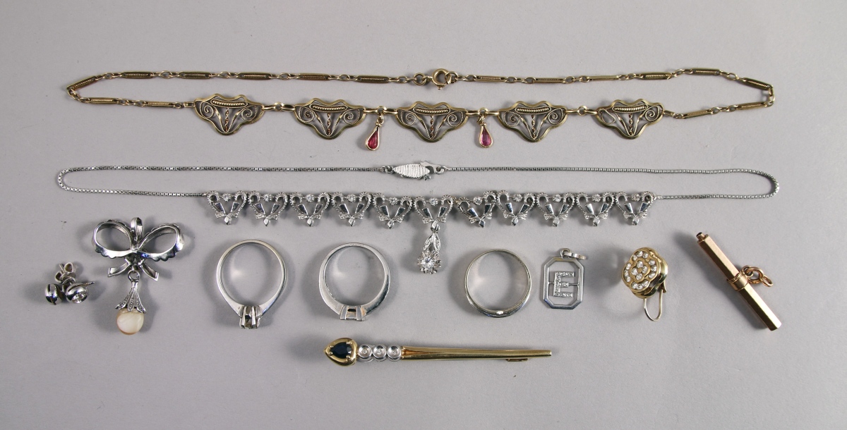 RÉUNION de 11 BIJOUX en or jaune ou blanc 18K sertis de pierres ou de perles: trois bagues, deux colliers, deux pendentifs, une broche, une paire de boucles d'oreille, une bouce d'oreille et une clef de montre.