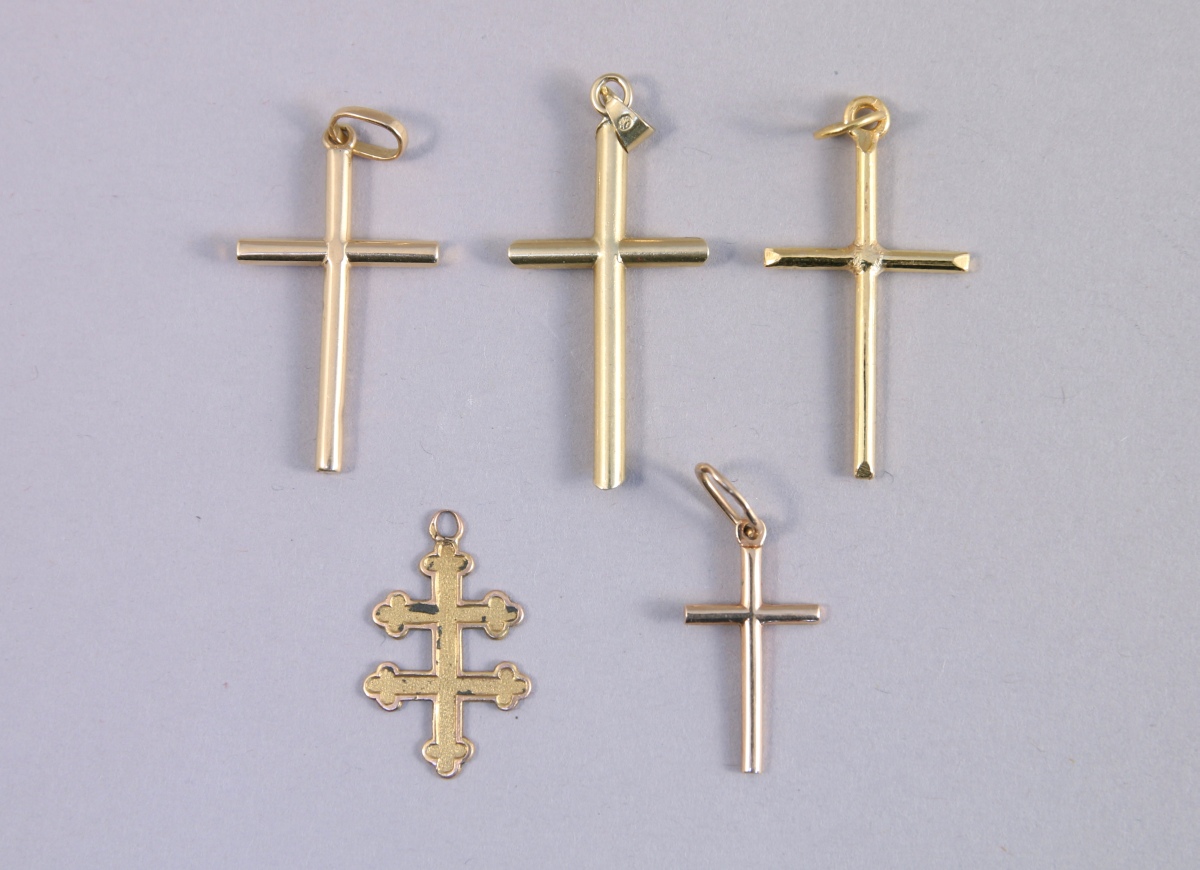 RÉUNION de CINQ CROIX PENDENTIFS en or jaune dont une croix de Lorraine trefflée.