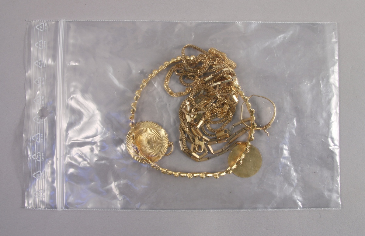 OR jaune À LA CASSE, 22K, dont chaînes et médaille.