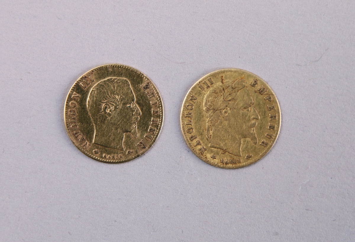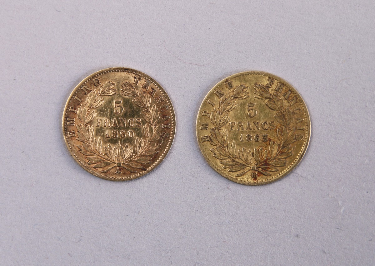 FRANCE. Napoléon III. DEUX PIÈCES de 5F OR. L'une tête nue (Paris, 1860), l'autre tête laurée (Strasbourg, 1863).