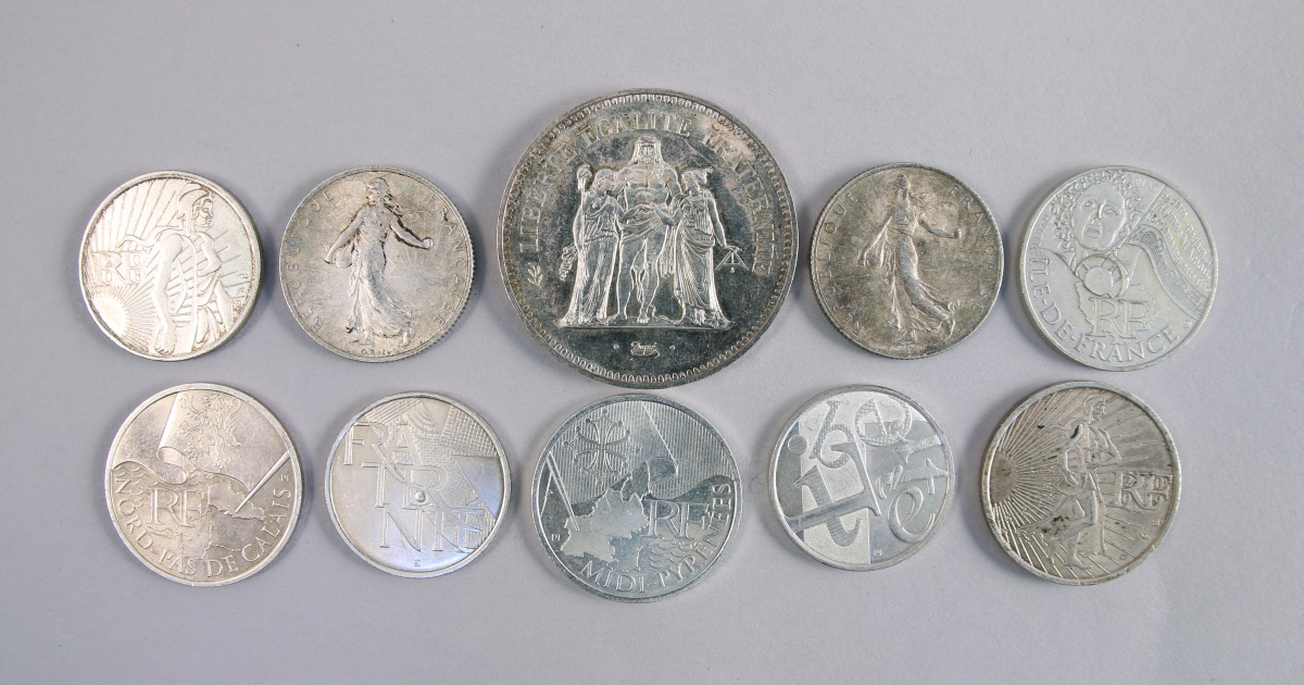 10 MONNAIES argent: 50 F Hercule (1974), deux 2 F semeuse (1916), quatre 10 (Midi-Pyrénées 2010, Nord-Pas-de-Calis 2010, Île-de-France 2012 et Semeuse 2009) et trois 5 (Semeuse 2008, Fraternité 2013 et Liberté 2013).