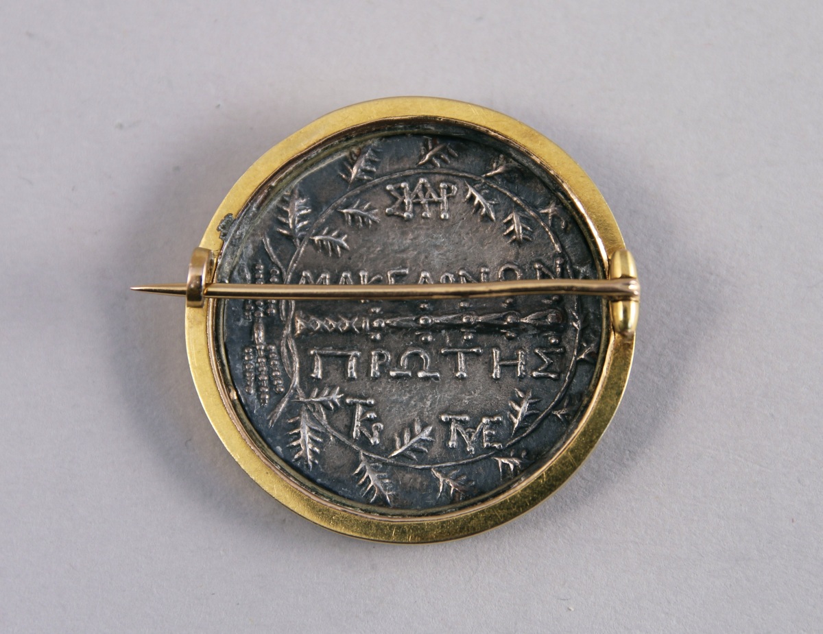 MACÉDOINE. Tétradrachme d'argent de Macédoine sous la domination romaine 167-147. Sertie dans une broche en or 18K.
