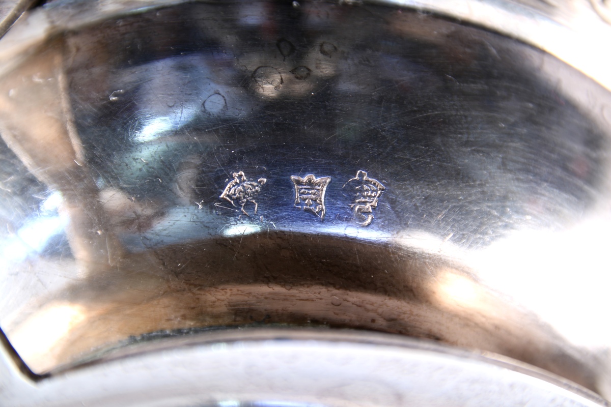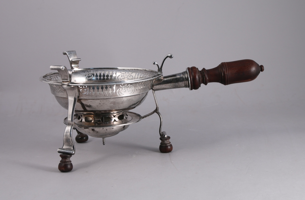 LILLE. RÉCHAUD de TABLE à BRAISES en argent. La bordure ajourée d'une frise de rinceaux, le réceptacle d'une frise d'oves. La grille à décor ajouré de ferronneries telles que agrafes et enroulements. Manche latéral en bois naturel tourné. Il repose sur trois pieds boule en bois.