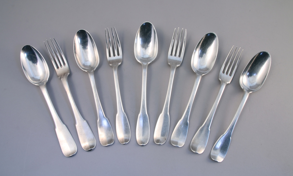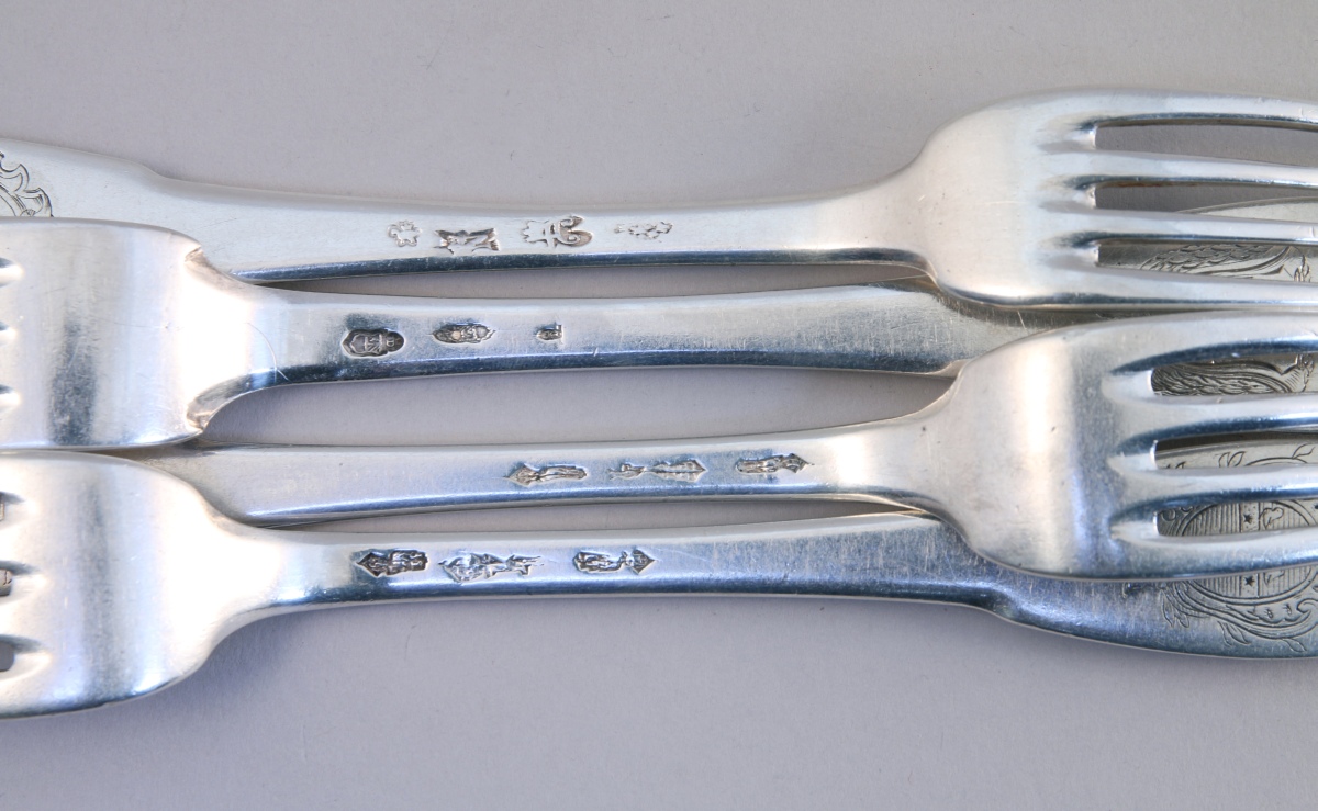 - BOURGES. Suite d'UN COUVERT et d'UNE CUILLÈRE. Poinçons aux Fermiers Généraux de la juridiction de Bourges. Charge: 1774-1780 ou 1780-1789. Poinçon de Maître, I, un mouton P sous une couronne, appliqué deux fois. Poids: 258 g.