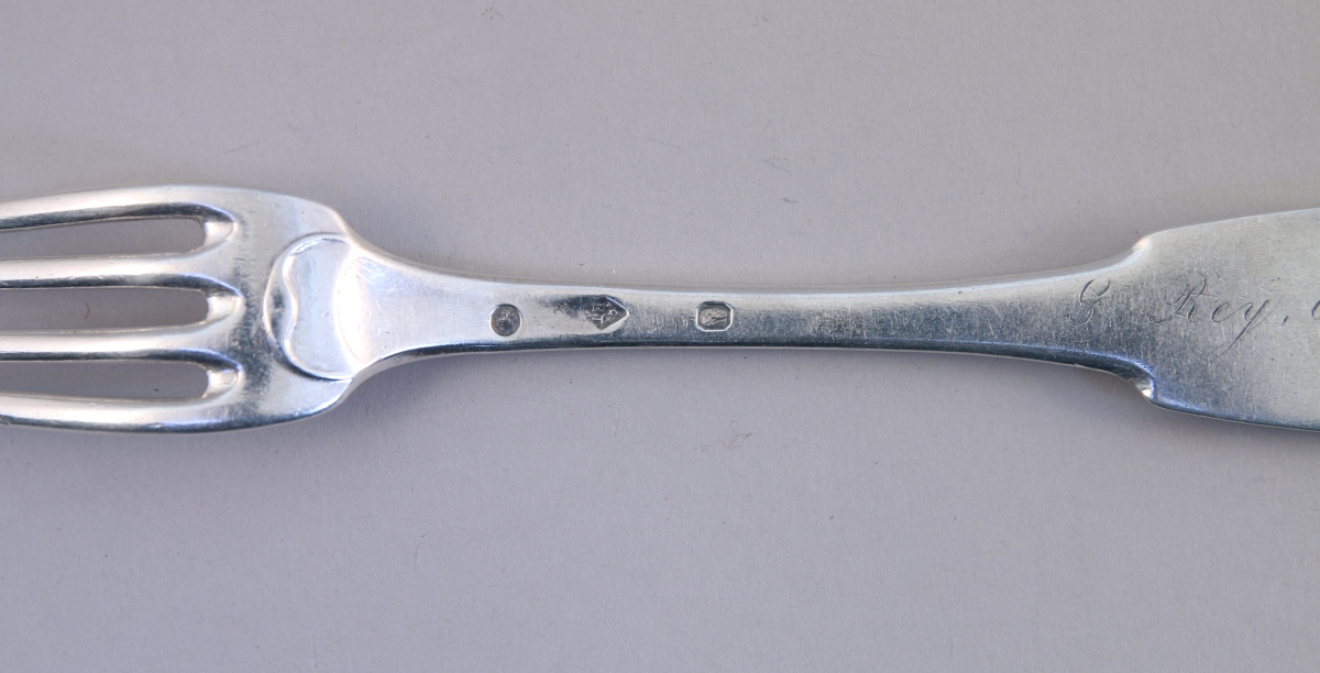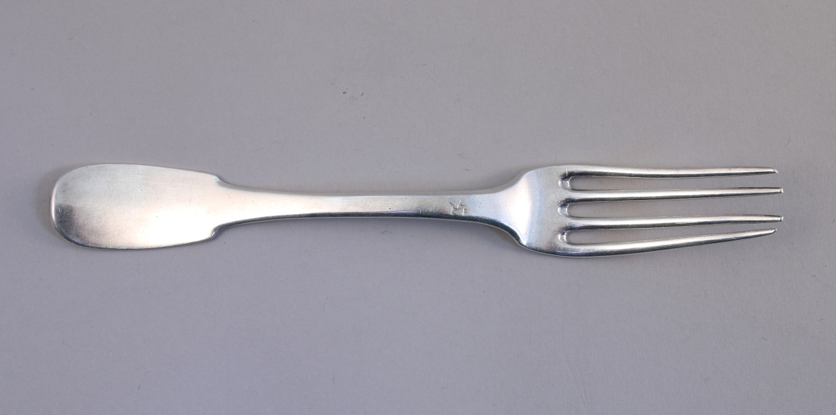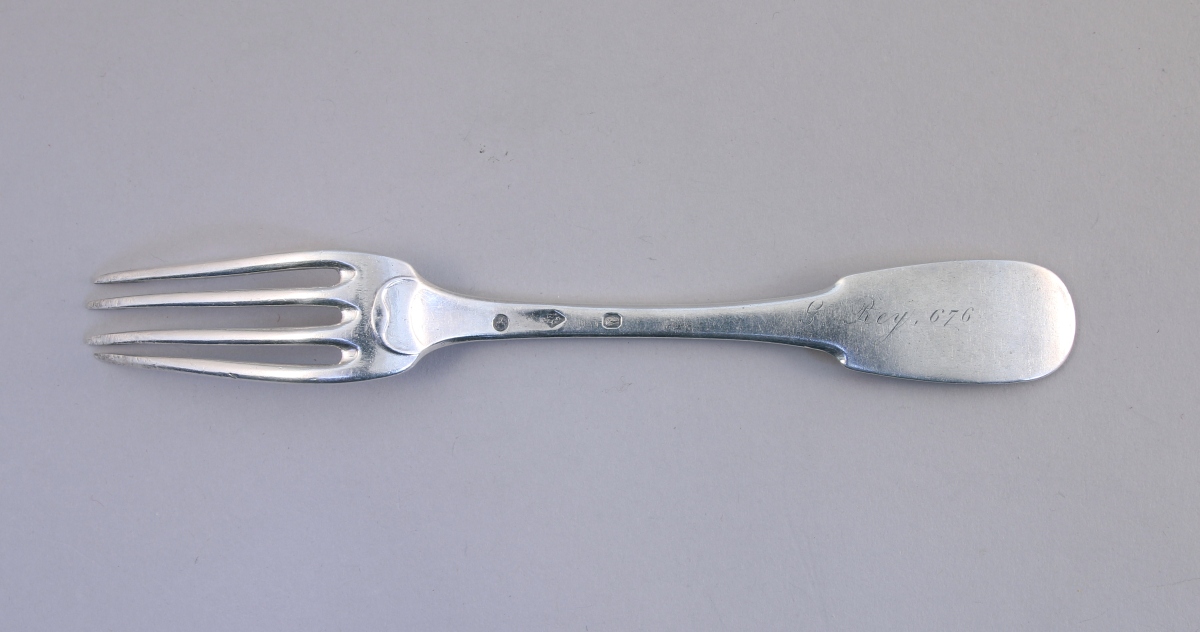 JOINT: FOURCHETTE de pensionnaire, en argent, modèle uniplat. Spatule gravée "G. Rey. 676". Poinçon Vieillard, Paris, 1819-1838. Poids: 70 g.