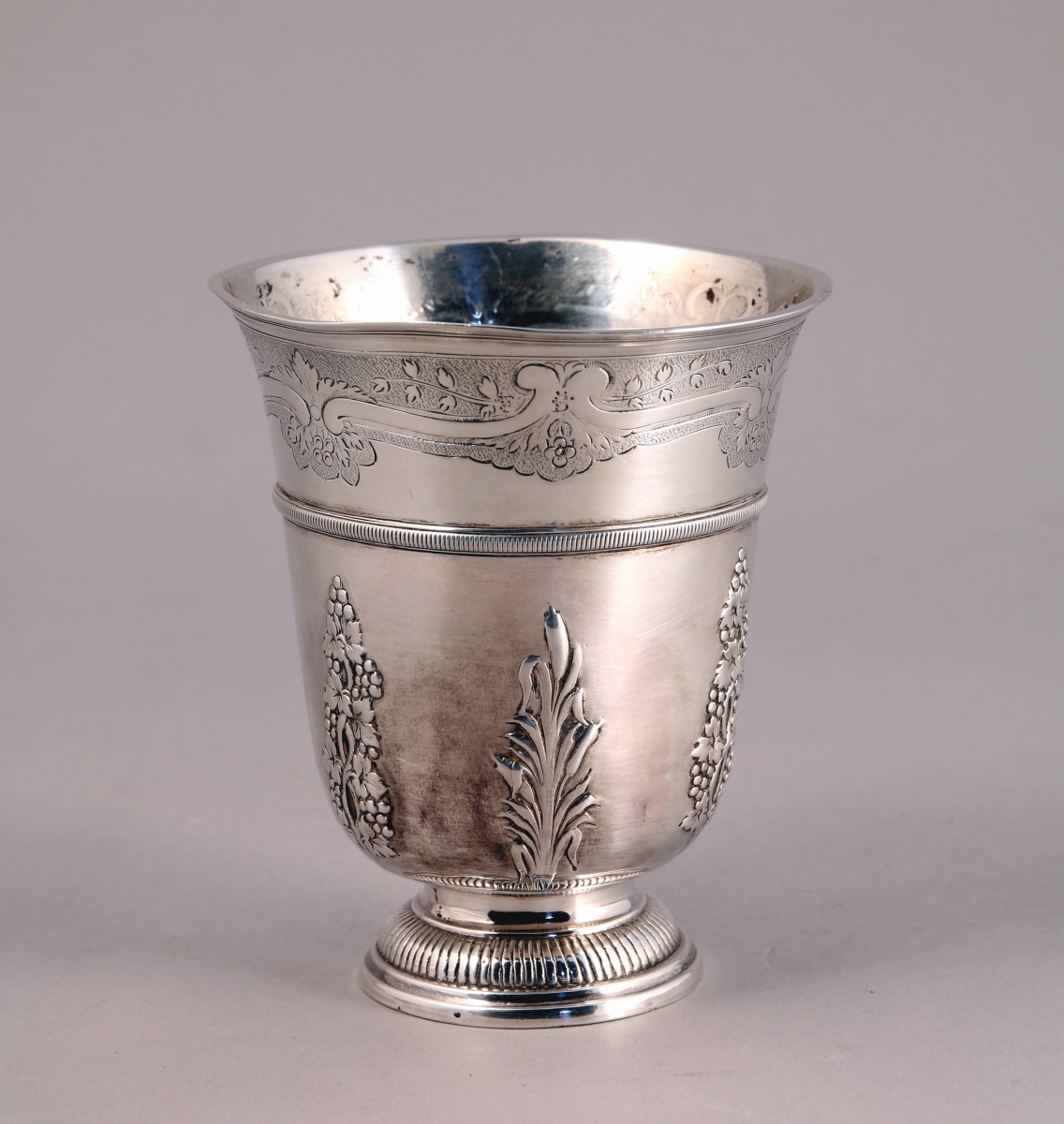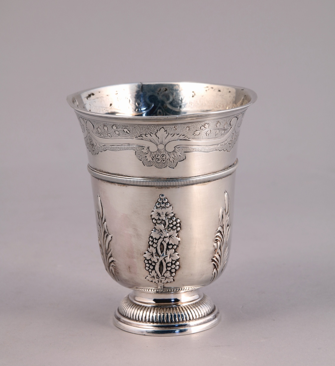 PARIS. TIMBALE dite TULIPE en argent repoussée à mi-corps de pampres de vignes en altrernance avec des roseaux. Le col souligné d'un décor circulaire d'agrafes, acanthes et motifs floraux sur fond amati. Elle repose sur un piédouche à frise godronnée.