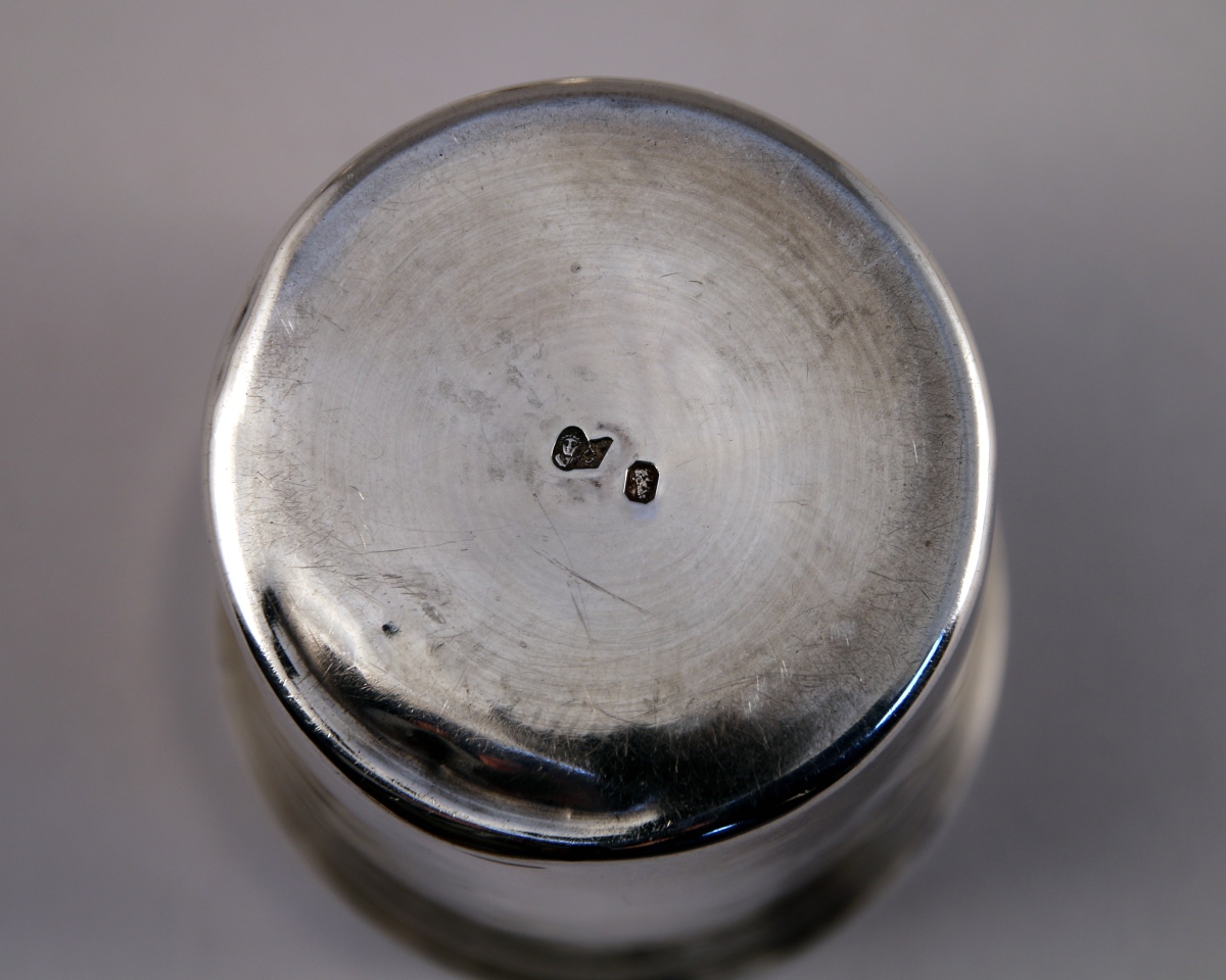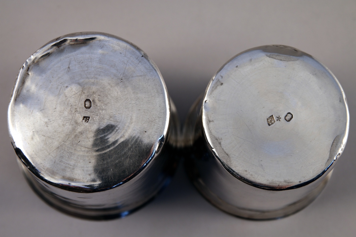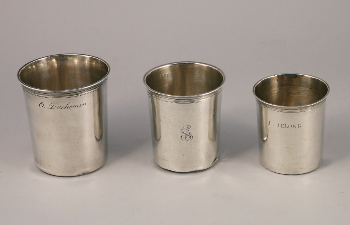 Trois TIMBALES de COLLÉGIEN en argent, marquées "O. Duchemin", "SS" et "J. Lelong". Poinçons Vieillard (1818-1838).