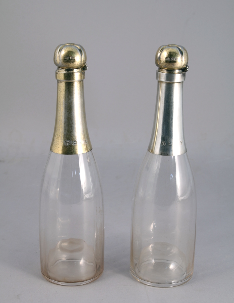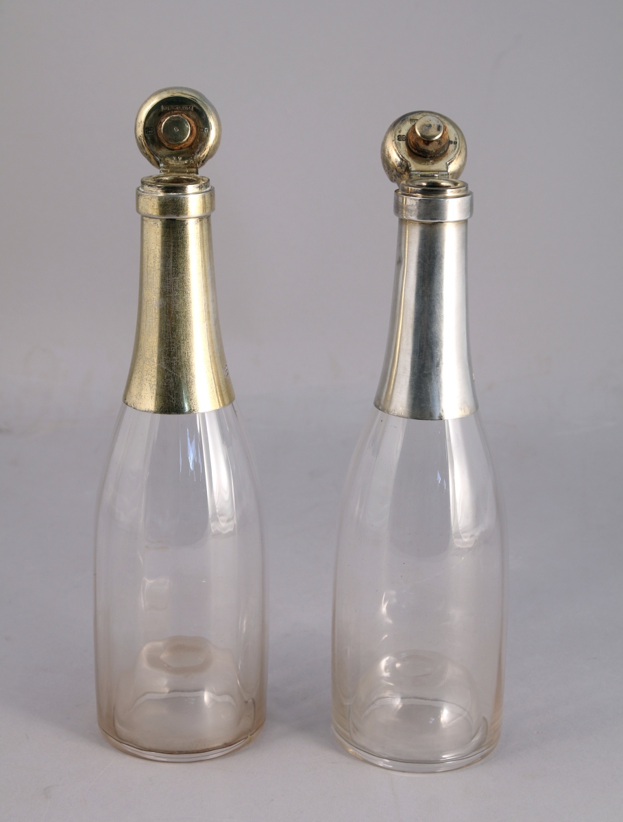 PAIRE de BOUTEILLES en verre à côtes. Le col et le goulot montés de vermeil. Bouchon à charnière quadrilobé.