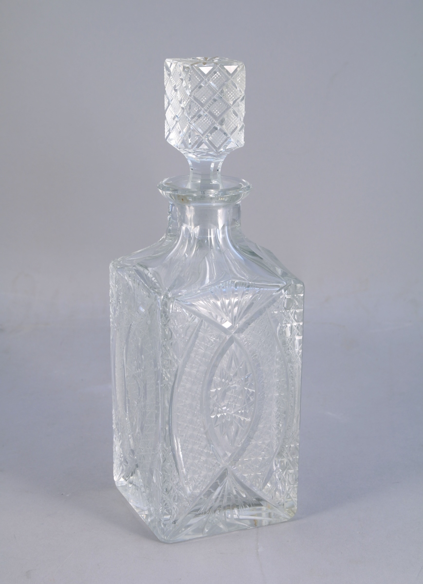 JOINT: CARAFE de forme rectangulaire en cristal taillé d'un riche décor géométrisant.