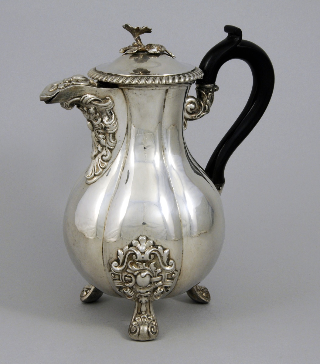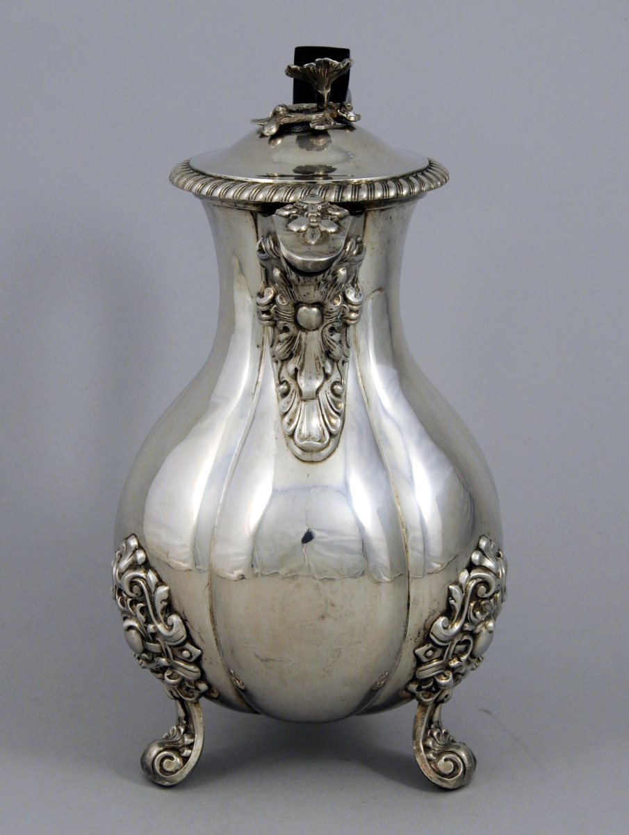 CAFETIÈRE en argent de forme balustre à côtes. Couvercle à prise en forme de fleur, bec à écusson et feuilles d'acanthe. Repose sur trois pieds à coquilles et attaches de cuirs découpés. Anse en bois noirci.