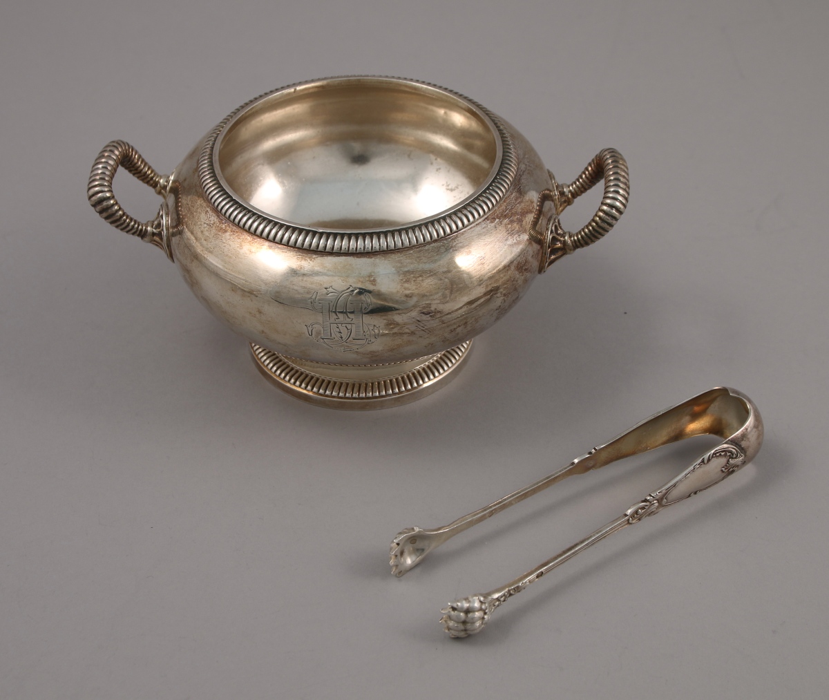 SUCRIER de forme ronde en argent reposant sur un piédouche. Il est orné d'une frise de godron au col et au pied. Les anses latérales à attache en palmette adoptent le même motif. La panse monogrammée "CH".