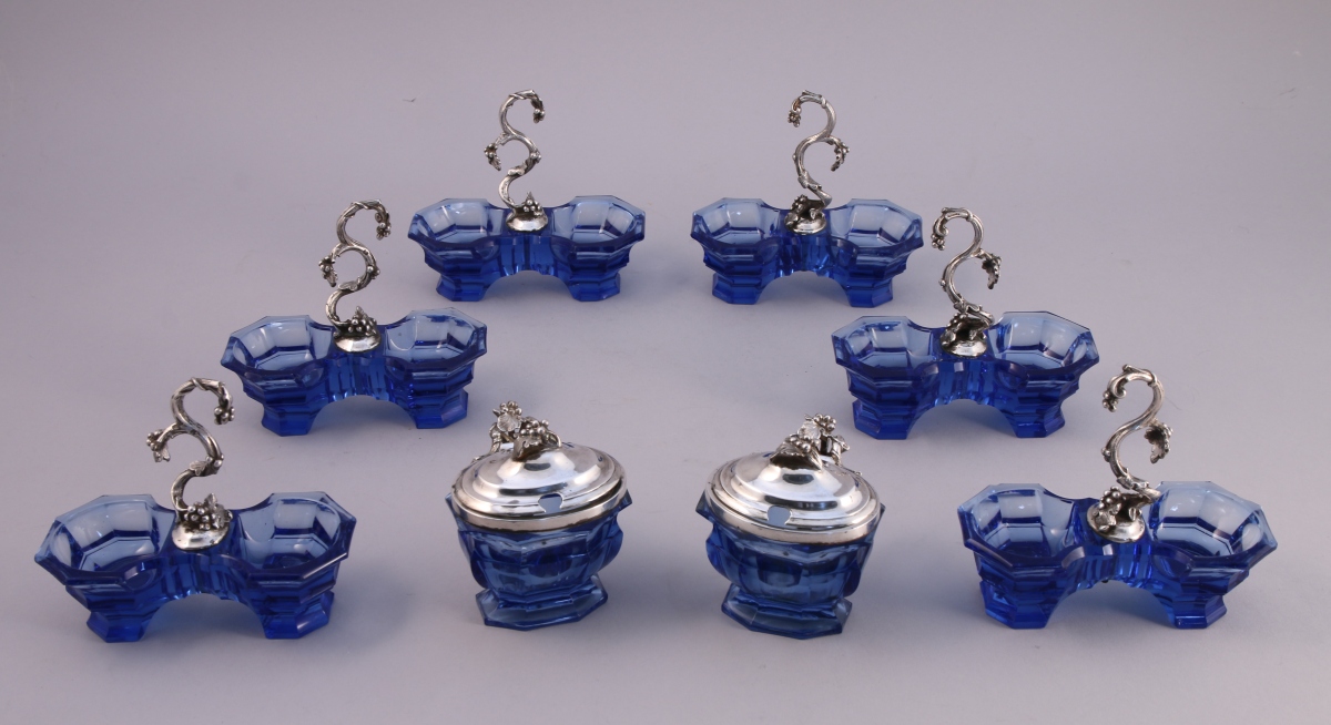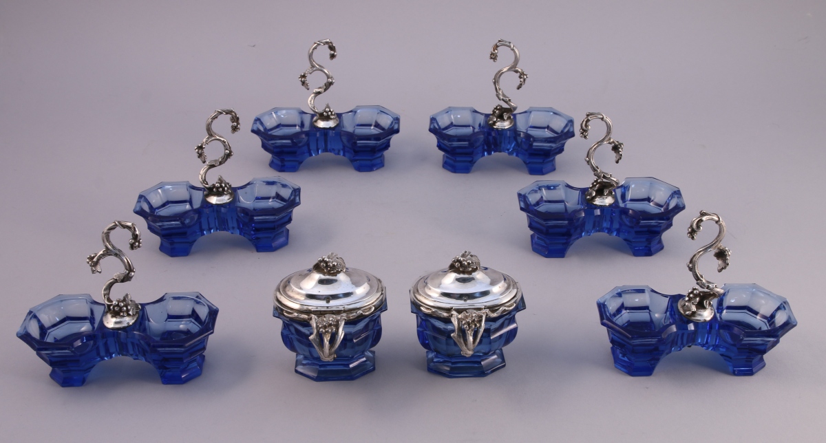 ENSEMBLE de 6 SALIÈRES DOUBLES et 2 MOUTARDIERS en argent, les godets en verre bleu à pans. La prise des salières et l'anse des moutardiers adoptent la forme d'un pampre de vigne. Le fretel figure une grappe de raisin posée sur une feuille.