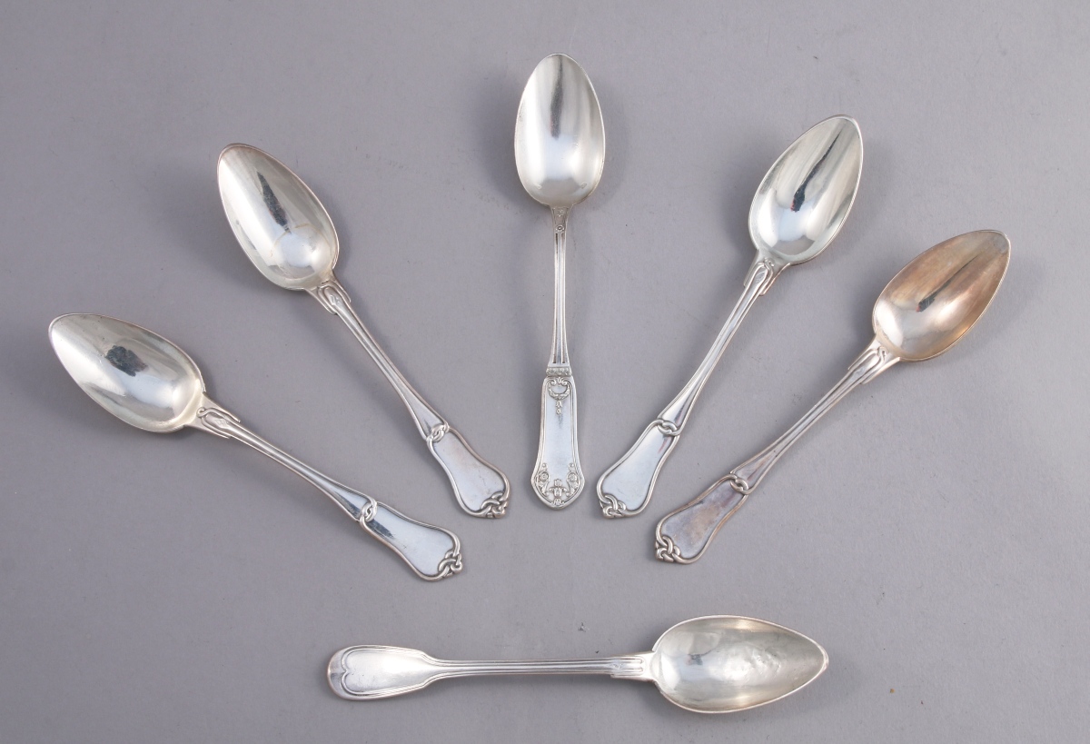 JOINT: CINQ CUILLÈRES À CAFÉ, quatre au noeud gordien, une à filet-contour auxquelles on joint une cuillère à café en métal argenté. Poids: 120 g.