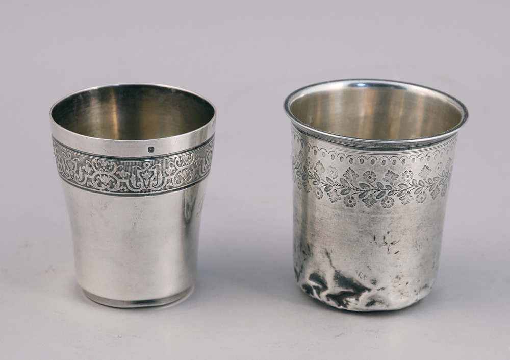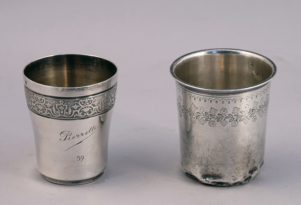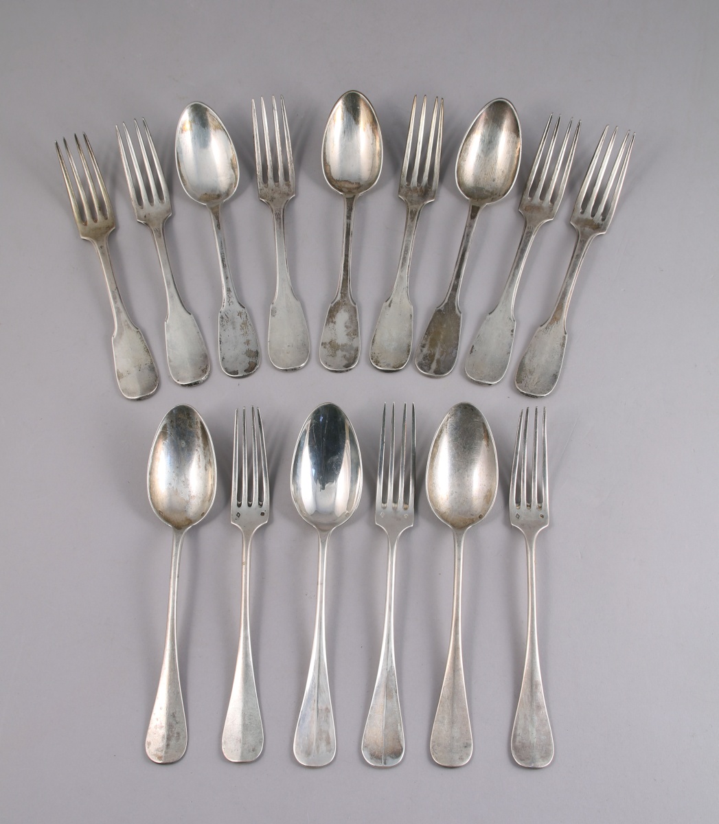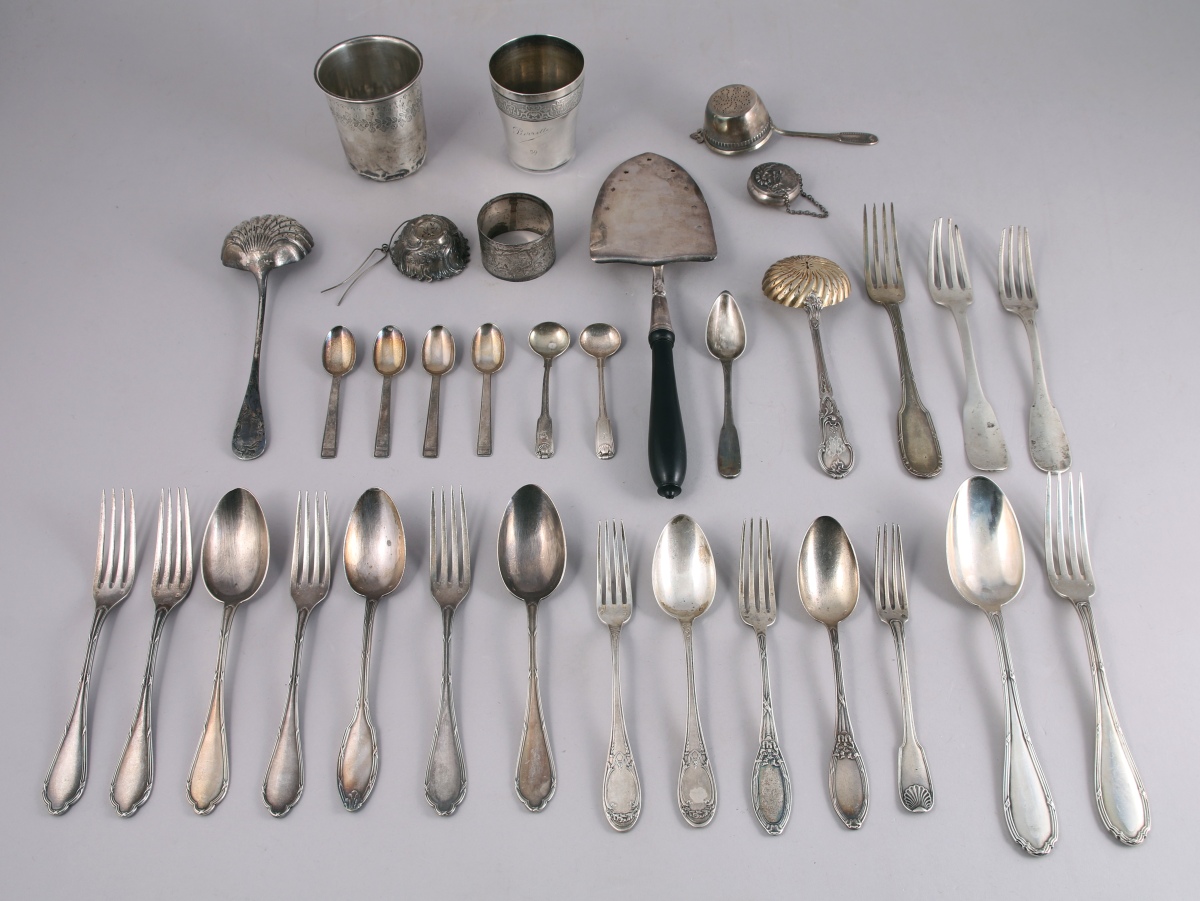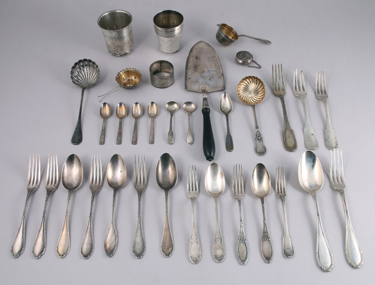 - DIVERS: CUILLÈRE À SAUPOUDRER; suite de TROIS COUVERTS, modèle uniplat; suite de TROIS COUVERTS À ENTREMETS et d'une FOURCHETTE, modèle à joncs rubanés; paire de CUILLÈRES À MOUTARDE anglaises; DEUX TIMBALES; DEUX COUVERTS D'ENFANT; FOURCHETTE D'ENFANT; COUVERT, modèle à joncs rubanés; suite de QUATRE CUILLÈRES À MOKA; DEUX PASSE-THÉS; ROND DE SERVIETTE, petite BOÎTE, TROIS FOURCHETTES et une CUILLÈRE À CAFÉ. Poids total: 1 835 g.
