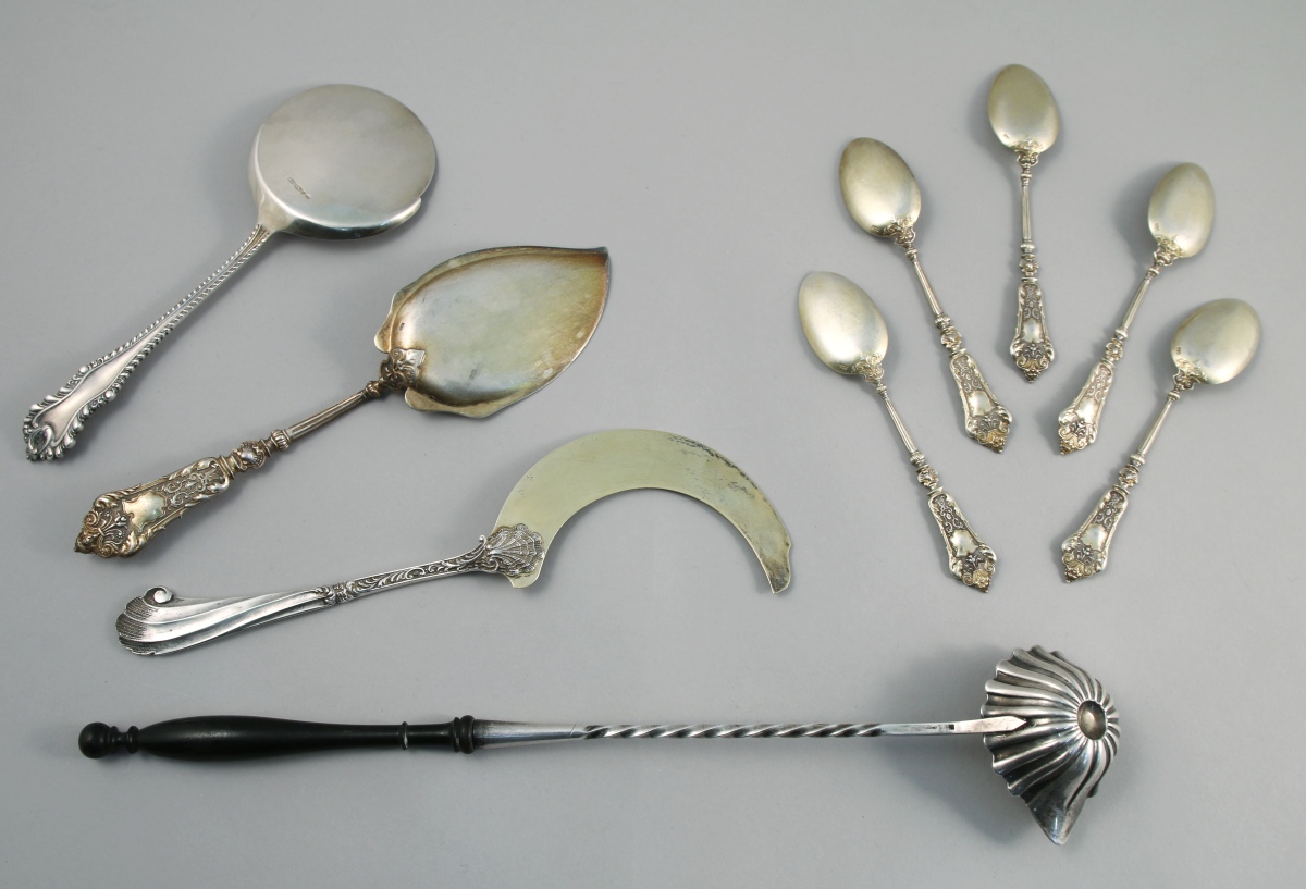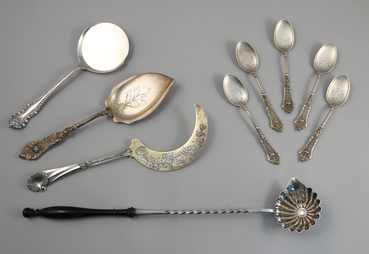 - PELLE de service et ses CINQ CUILLÈRES À CAFÉ en vermeil. La spatule très finement ciselée d'un mascaron bachique dans un décor de ferroneries, coquilles, enroulements et acanthes stylisées. Le cuilleron orné de motifs floraux. Travail étranger de style Louis XIV, seconde moitié du XIXe. Poids: 242 g.