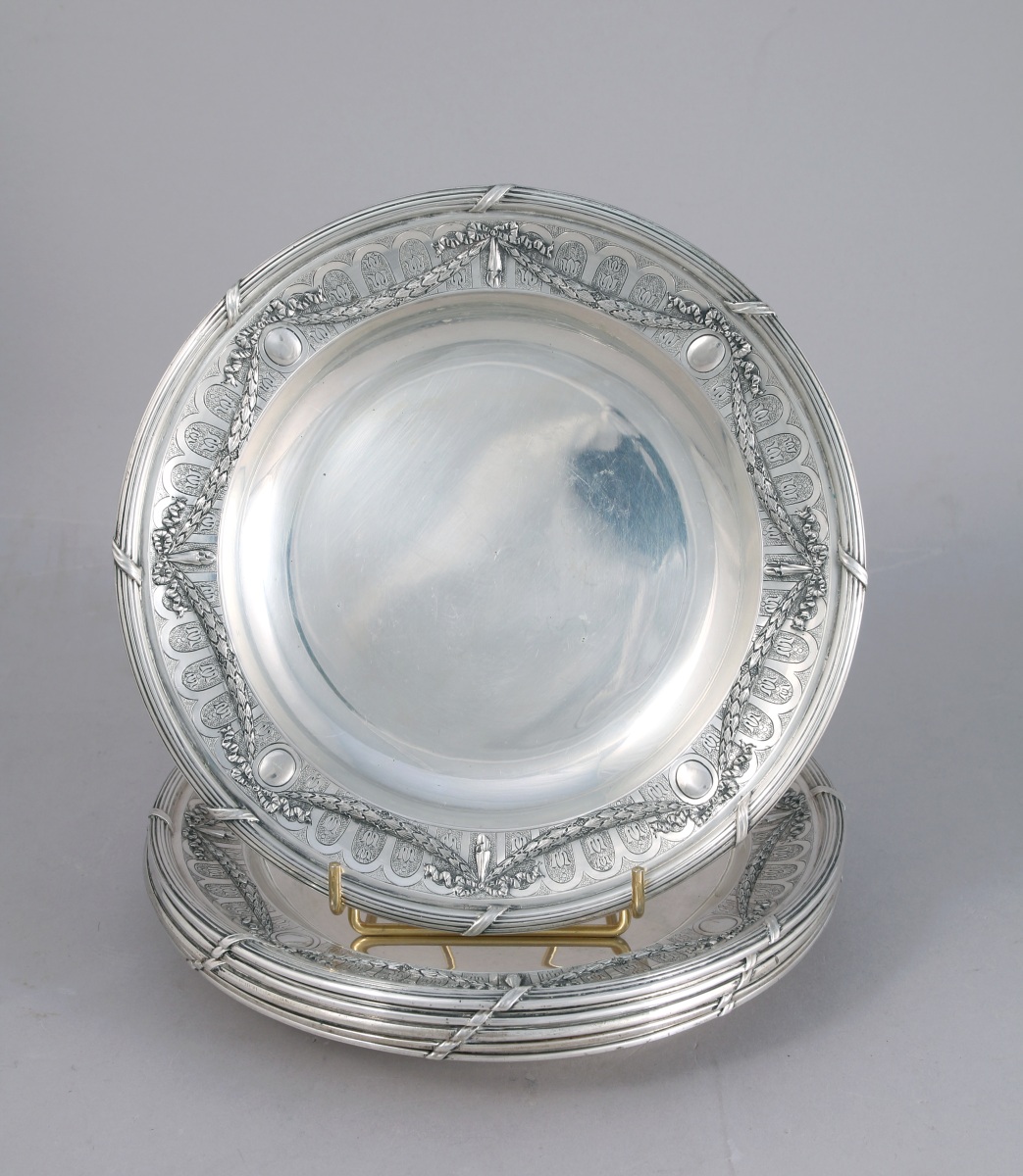 Suite de SIX ASSIETTES de forme ronde en argent. L'aile à décor de guirlandes de lauriers et de médaillons rubanés sur fond de frise fleuronnée. Le rebord à frise de joncs rubannés.