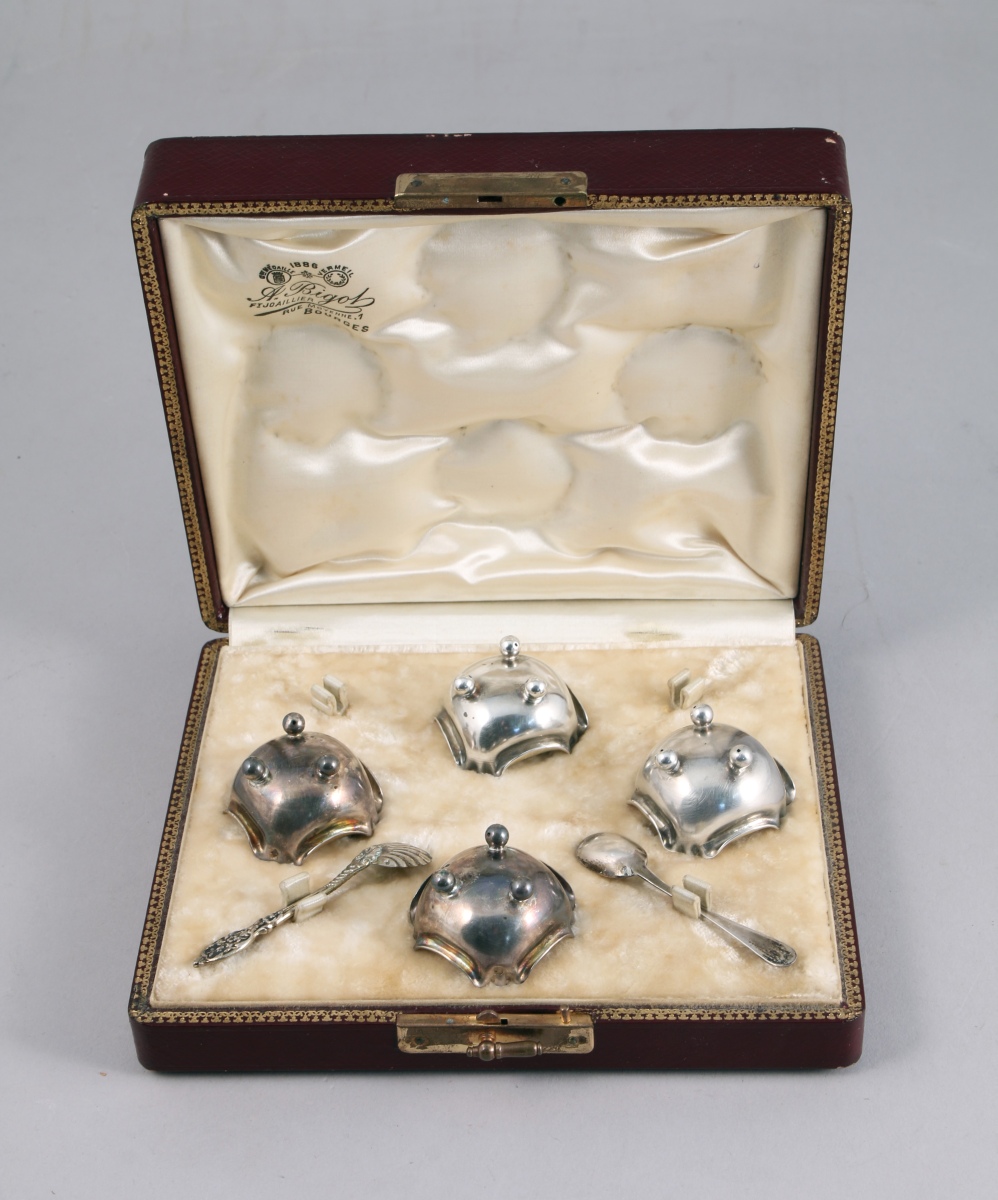 Suite de QUATRE petits SALERONS de forme hémisphérique en argent. Bords ourlés, intérieur vermeillé. Ils reposent sur trois pieds boule. Coffret.