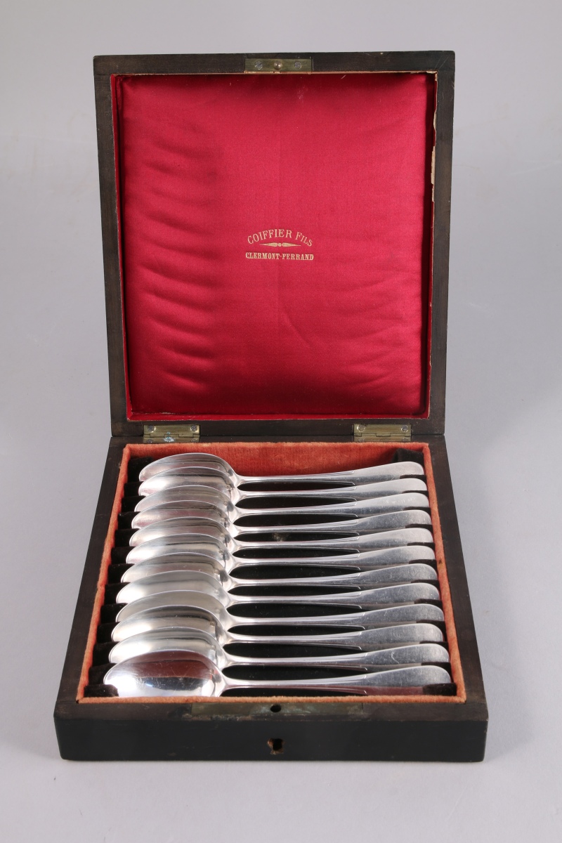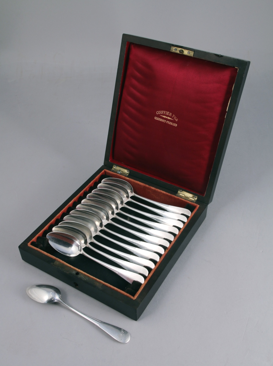 Suite de 12 CUILLÈRES À CAFÉ en argent, modèle uniplat. Le manche flanqué de deux canaux. La spatule monogrammée "MP".