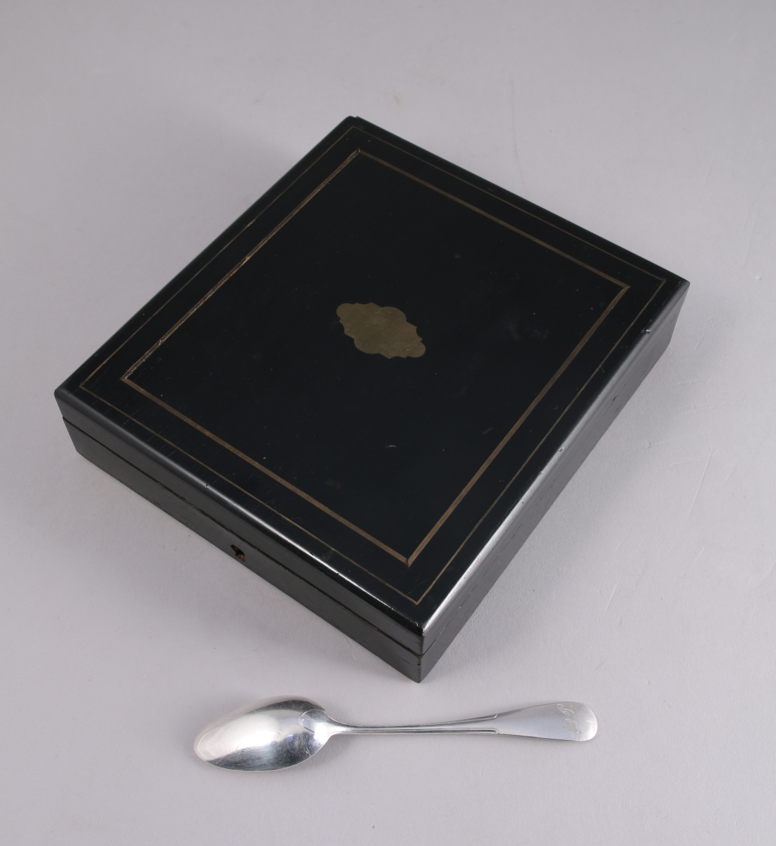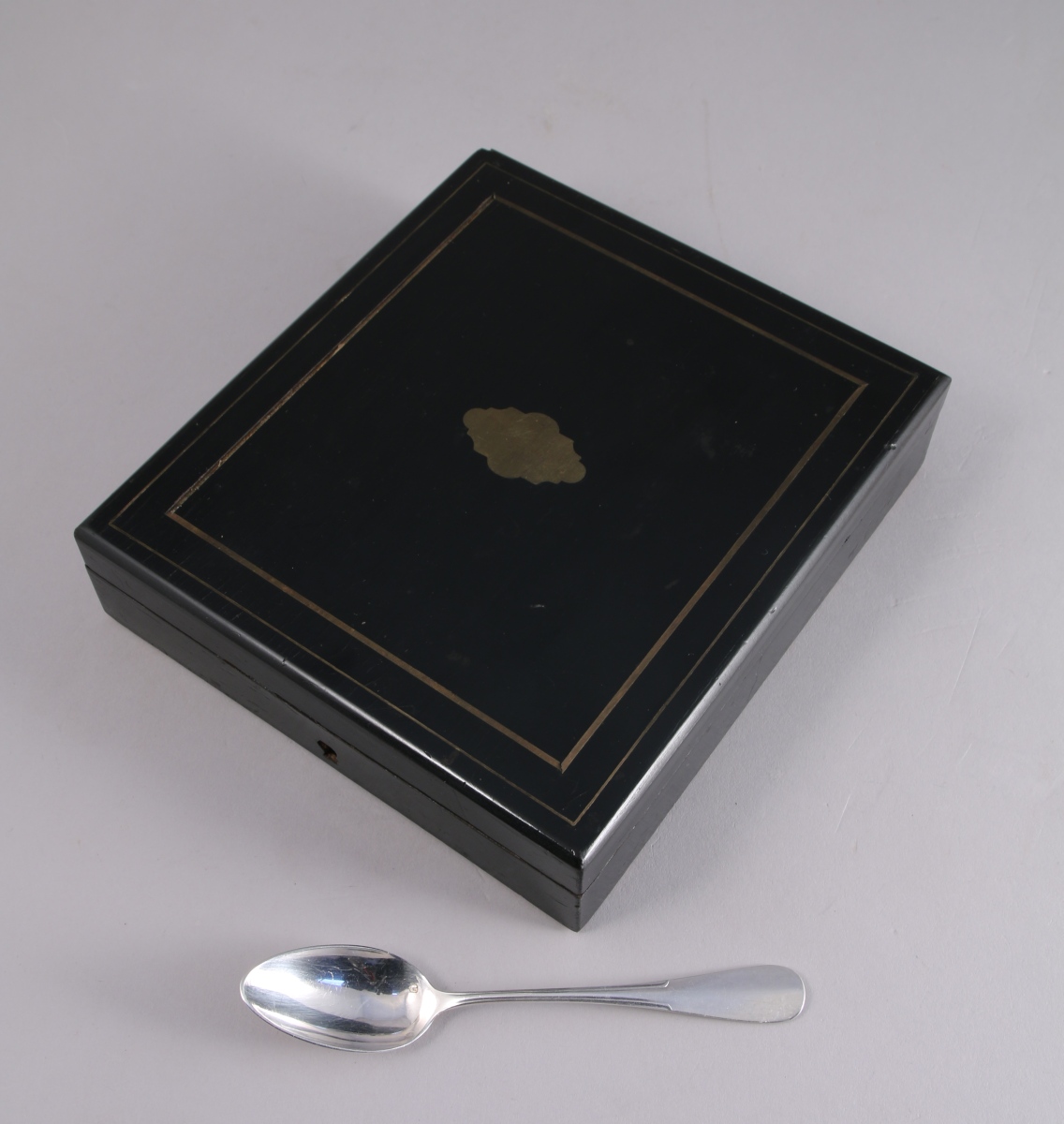 Écrin en bois noirci incrusté de filets de laiton et d'un cartouche chantourné.