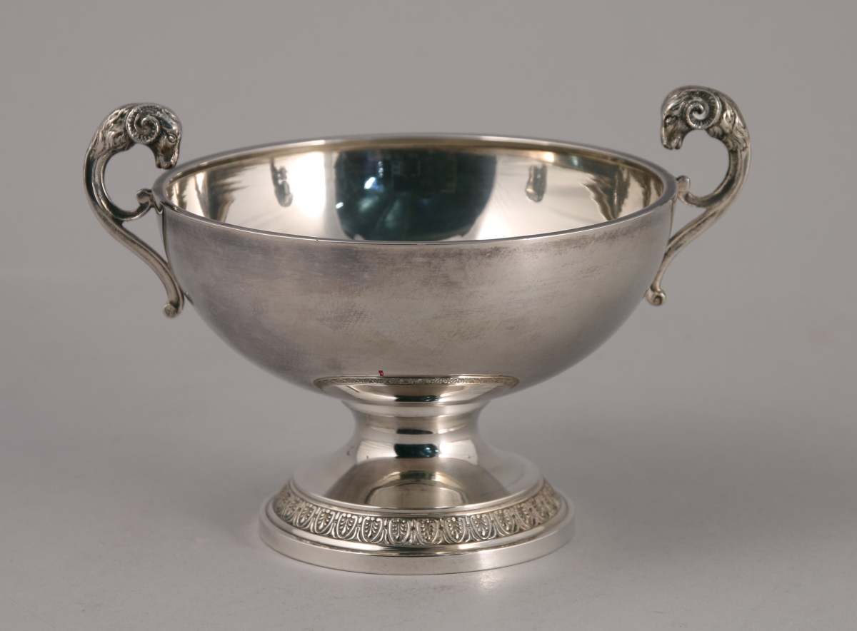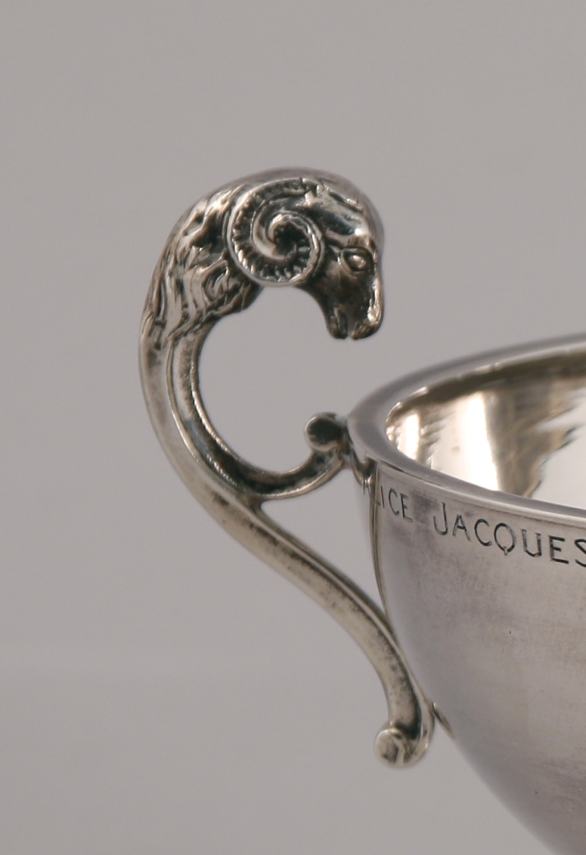 COUPE DE MARIAGE en argent uni reposant sur un piédouche à frise de palmettes. Anses à têtes de bélier terminées par des volutes. La panse gravée " Alice Jacques - Girard de Grenoble 1954 - ".