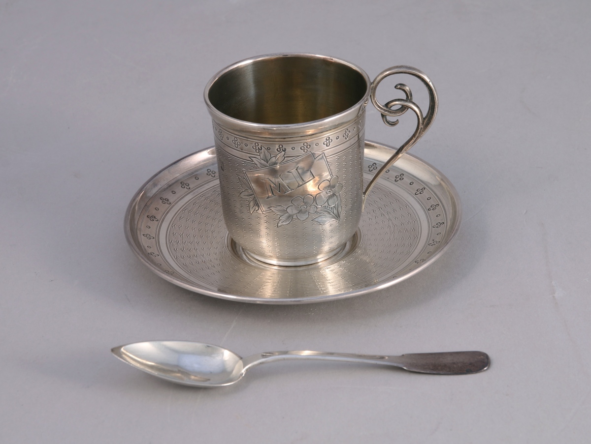 TASSE-À-CAFÉ et sa SOUS-TASSE en argent à décor guilloché. La tasse centrée d'un cartouche fleuri monogrammé "ML". Anse formée de feuilles de roseaux enroulées.