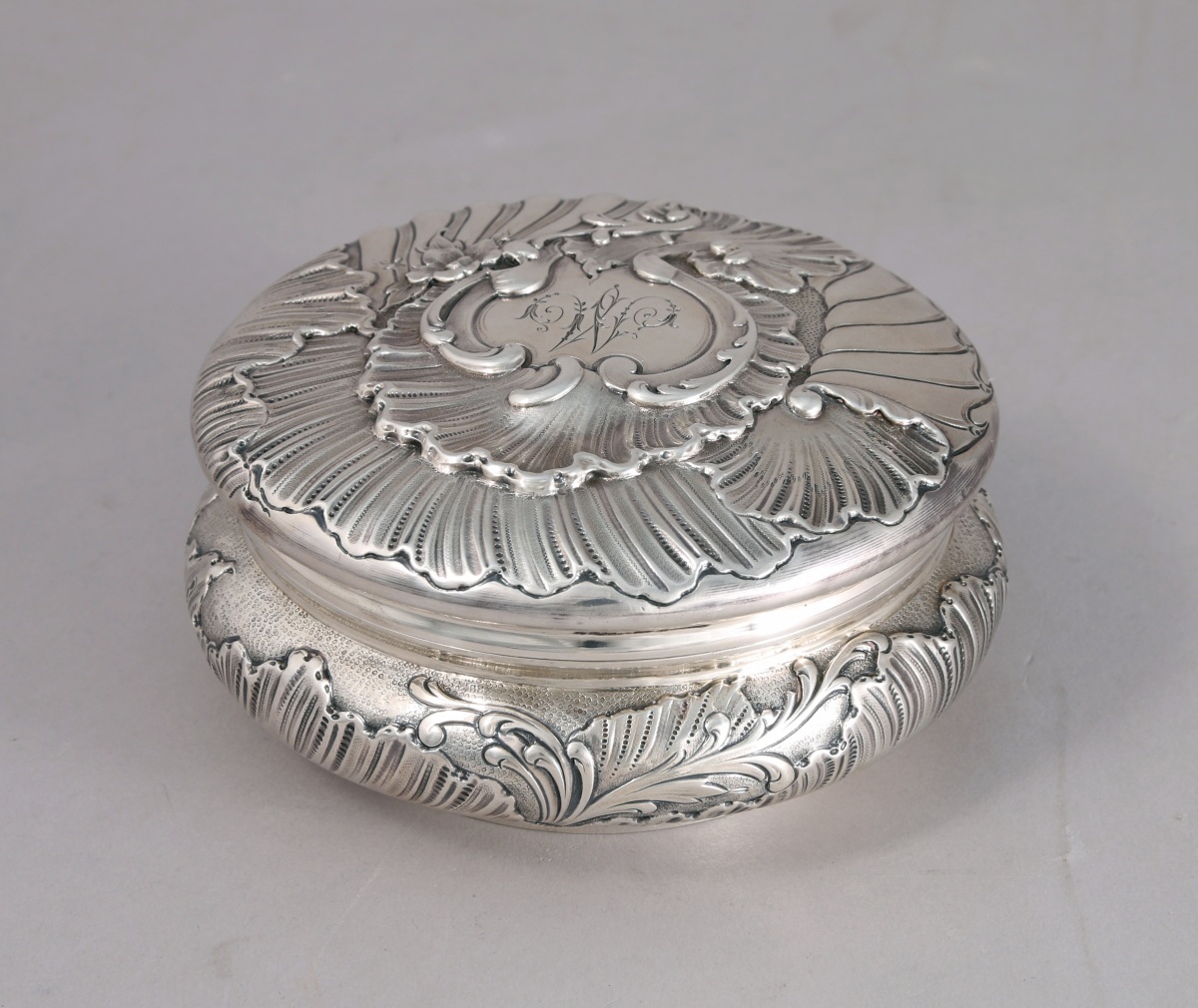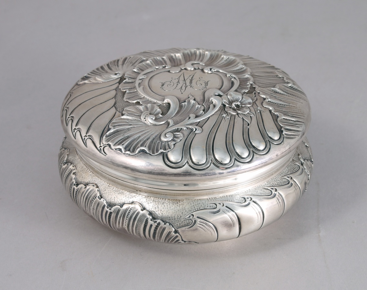 BONBONNIÈRE de forme ronde en argent. Riche décor de style rocaille tel que coquilles, enroulements et agrafes feuillagés, godrons, acanthes, fleur et ailes de chauve-souris.