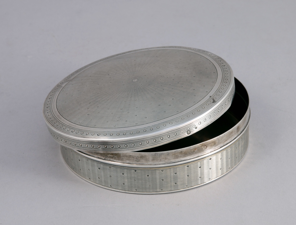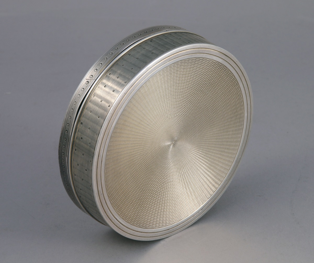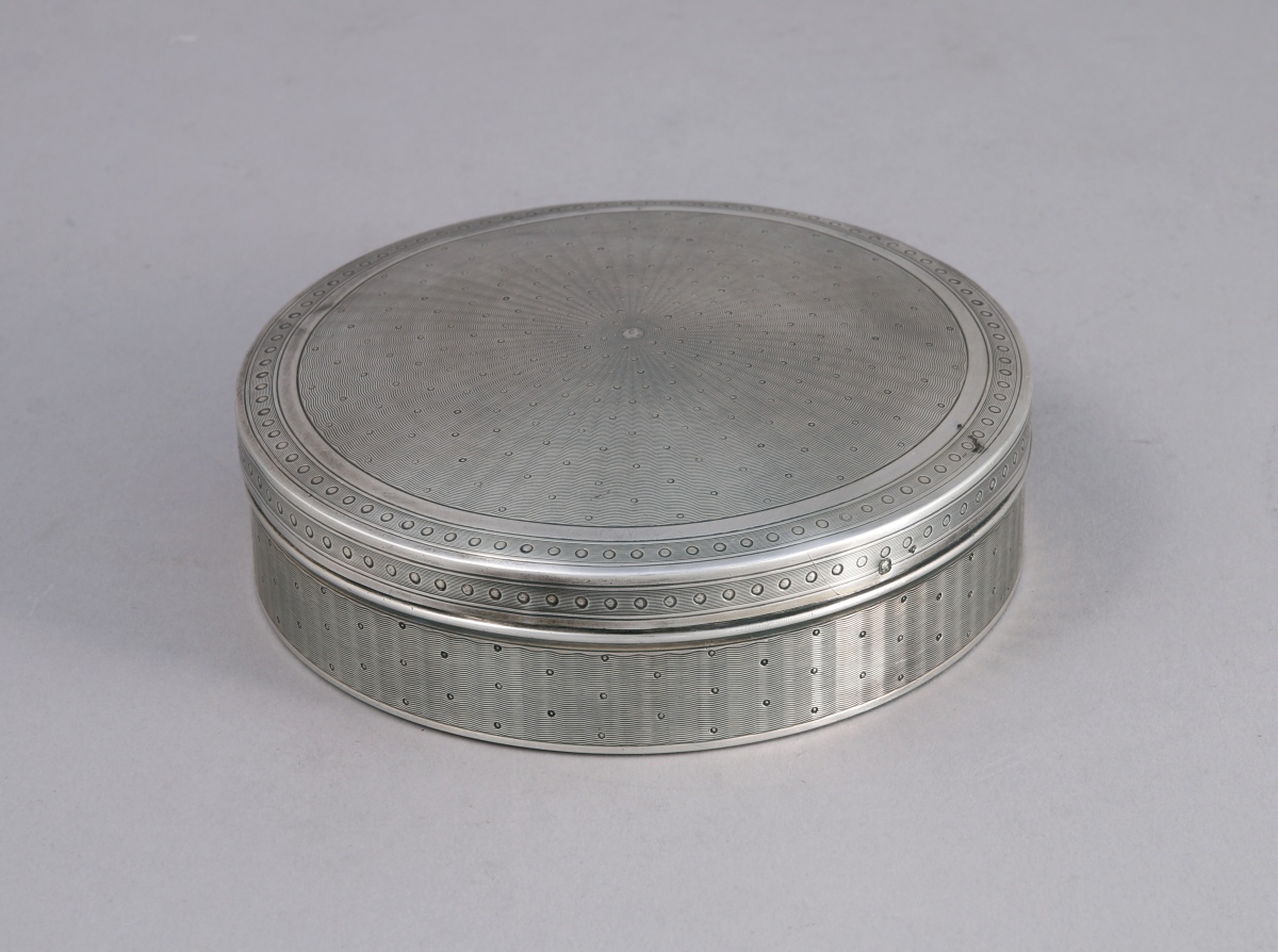 BOÎTE de forme circulaire en argent à décor guilloché rayonnant semé de pois.