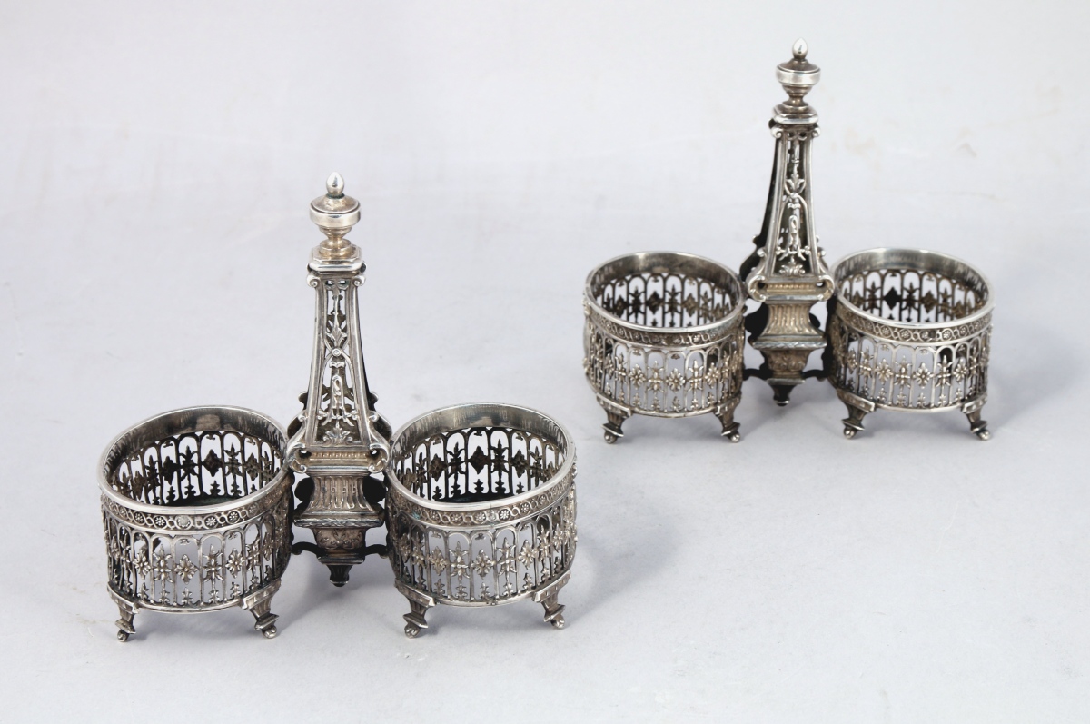 Paire de SALERONS doubles en argent. Réceptacles de forme ovale à riche décor ajouré de ferronneries fleuronnées. Monogrammés "CP" dans un médaillon ovale rubané. Prise adptant la forme d'un obélisque sommé d'une toupie. Pieds cannelés.