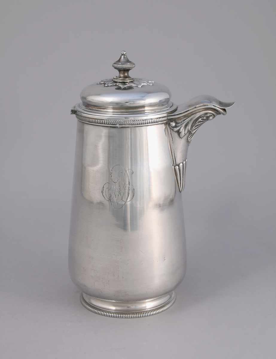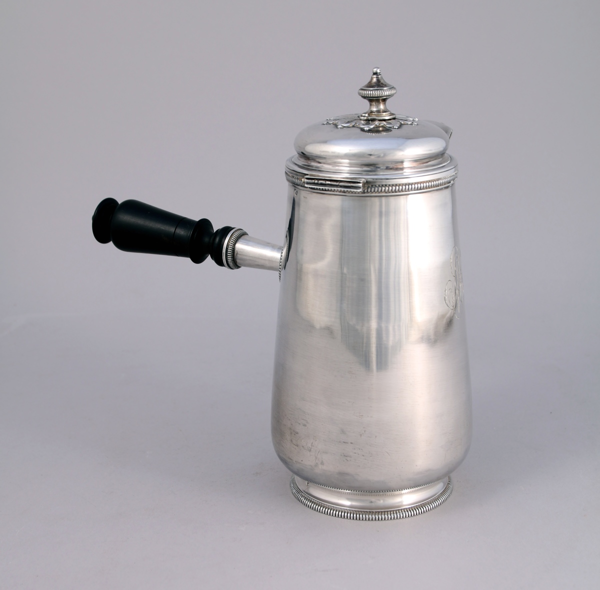 CHOCOLATIÈRE de forme tronconique en argent à décor de frises de godrons. Le corps monogrammé "AD". Bec verseur à décor d'une large coquille, agrafes feuillagées et godrons. L'orifice supérieur masqué par une toupie pivotante sur une terrasse fleuronnée. Manche latéral en ébène tourné. Elle repose sur un piédouche orné d'une frise de godrons.