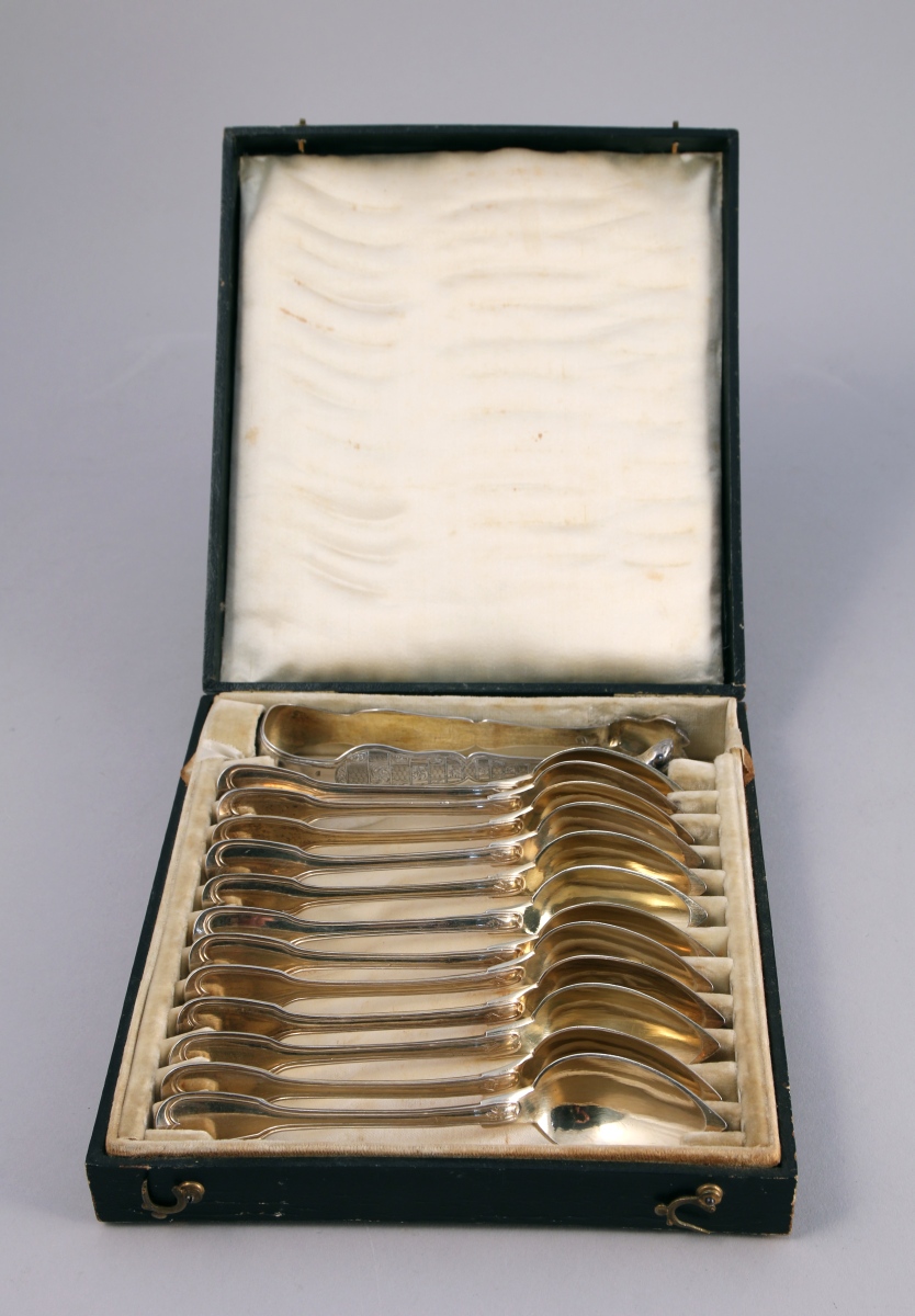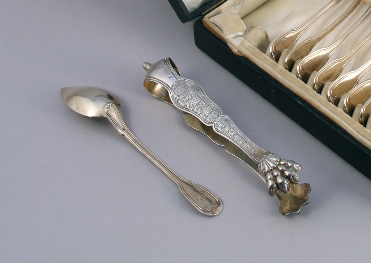 COFFRET contenant une suite de 12 CUILLÈRES À CAFÉ et une PINCE À SUCRE en vermeil. Les cuillères, modèle filets-contours, sont monogrammées "DB". La pince à sucre à pattes de lion présente un décor quadrillé orné de guillochis et d'acanthes stylisées. Elle est sommée d'un gland reposant sur une terrasse fleuronnée.