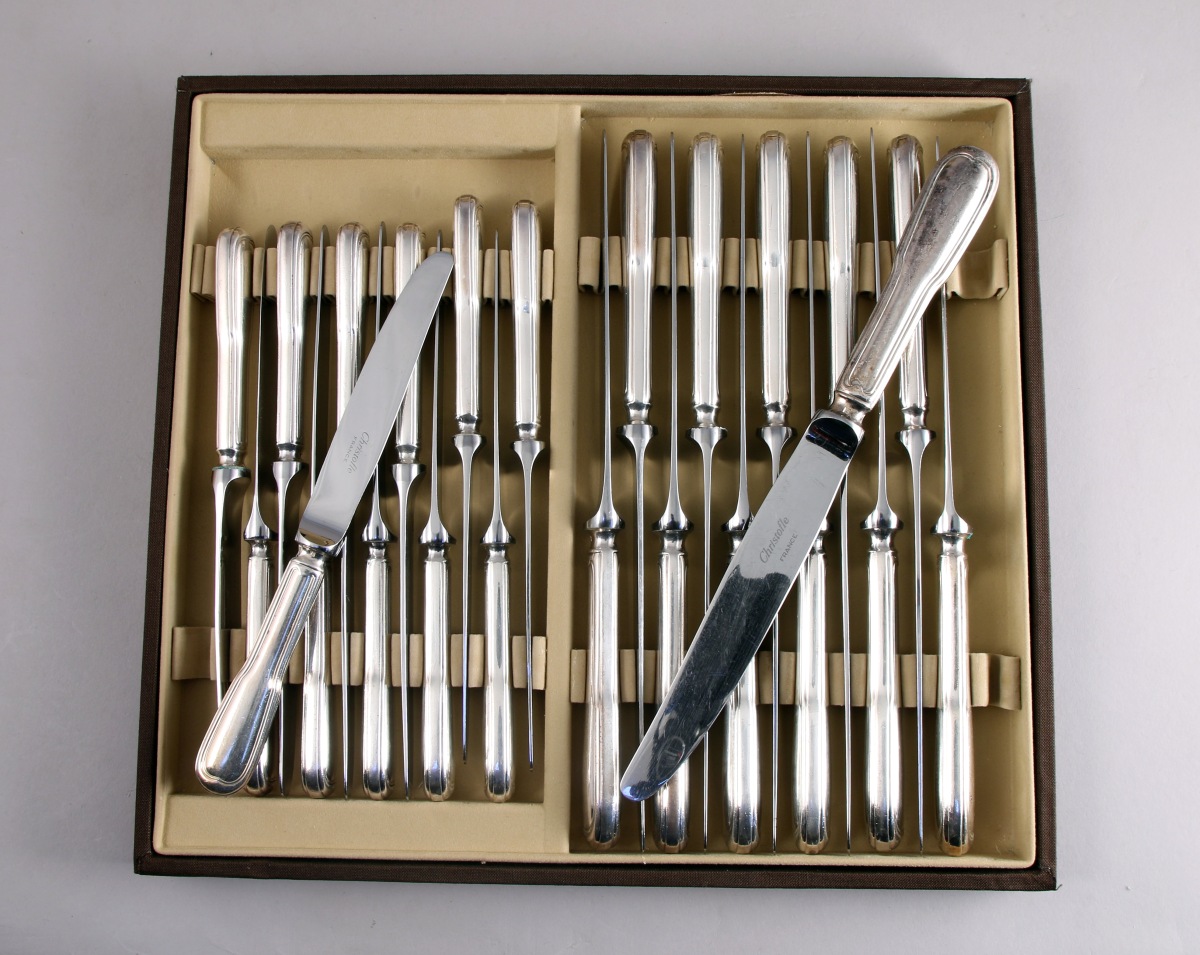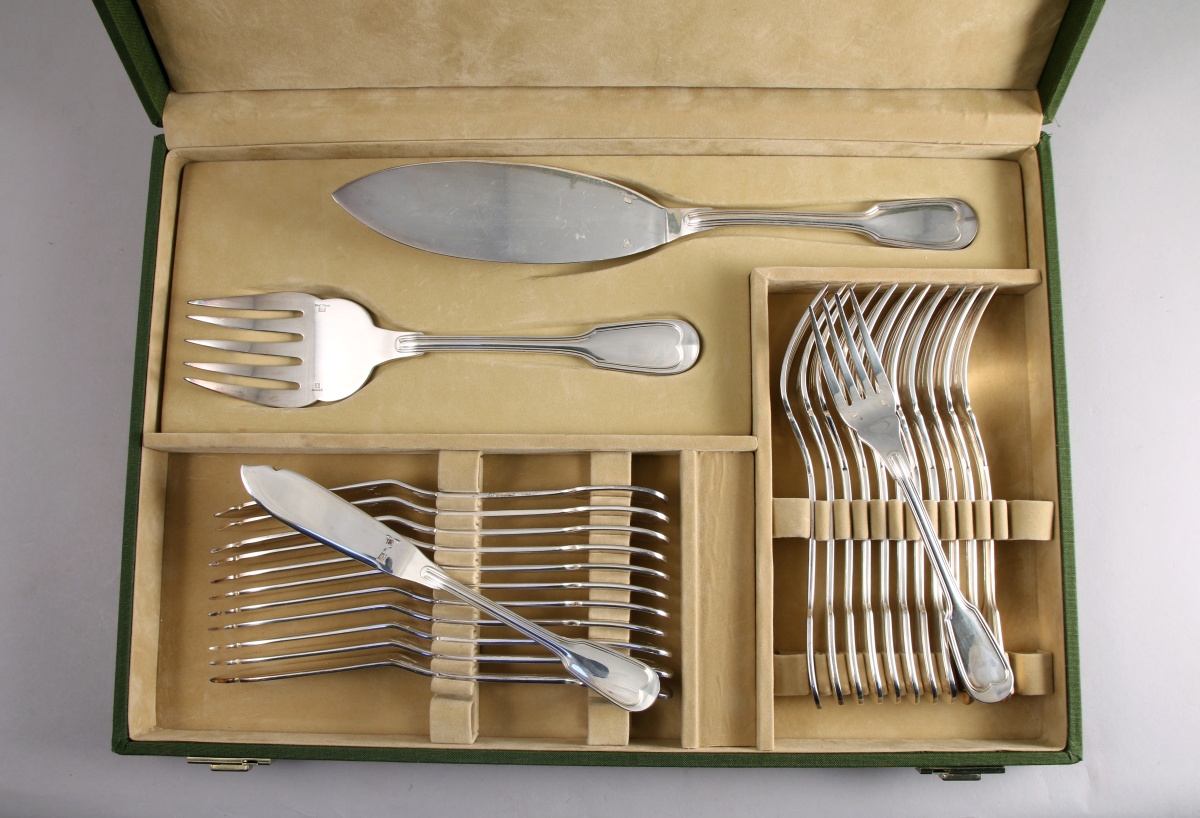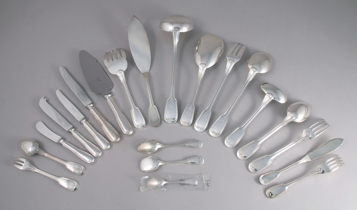 La MÉNAGÈRE, modèle filet-contours, se compose de 12 grands couverts, 12 grands couteaux, 12 cuillères à entremets, 12 couteaux à entremets, 12 fourchettes à poisson, 12 couteaux à poisson, huit fourchettes à gâteau, 12 cuillères à café, six cuillères à glace, deux cuillères à moka, un couteau et une fourchette de service à poisson, un couvert à salade, une louche, une pelle à riz, un couteau à beurre, un couteau à fromage, une cuillère à crème et une pelle à tarte.