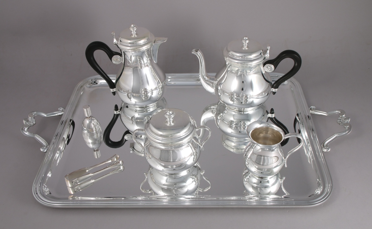 Le SERVICE À THÉ-CAFÉ en métal argenté uni se compose d'un grand plateau de service, d'une théière, d'une cafetière, d'un sucrier, d'un pot-à-lait, d'une pince à sucre et d'une clochette de service. Panse basse, fretel en toupie. Les anses du plateau sont constituées d'agrafes réunies par une coquille.