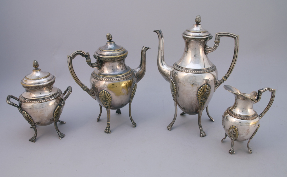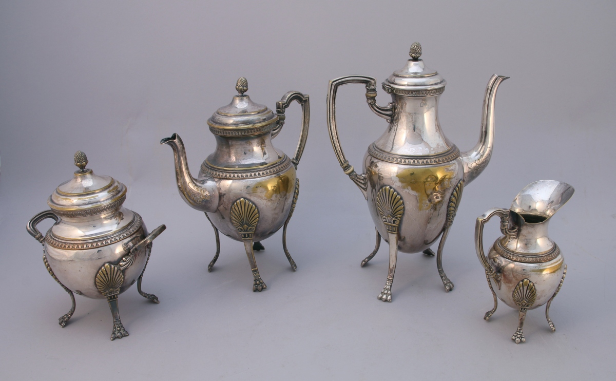 SERVICE À THÉ-CAFÉ en métal argenté composé d'une cafetière, d'une théière, d'un sucrier et d'un pot-à-lait. Décor de frises de feuilles d'eau, piètement quadripode à griffes et attaches palmettes. Fretel en pomme de pin.