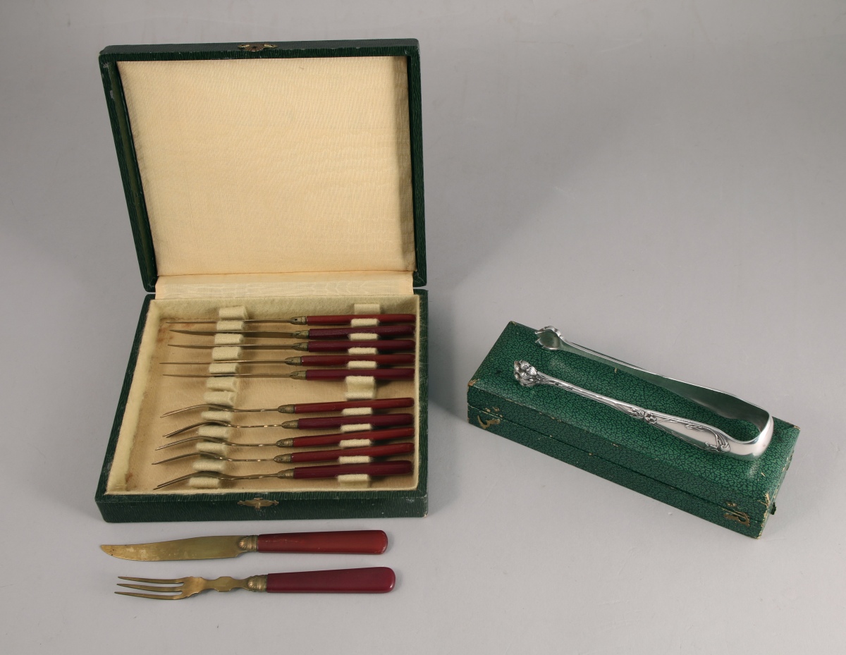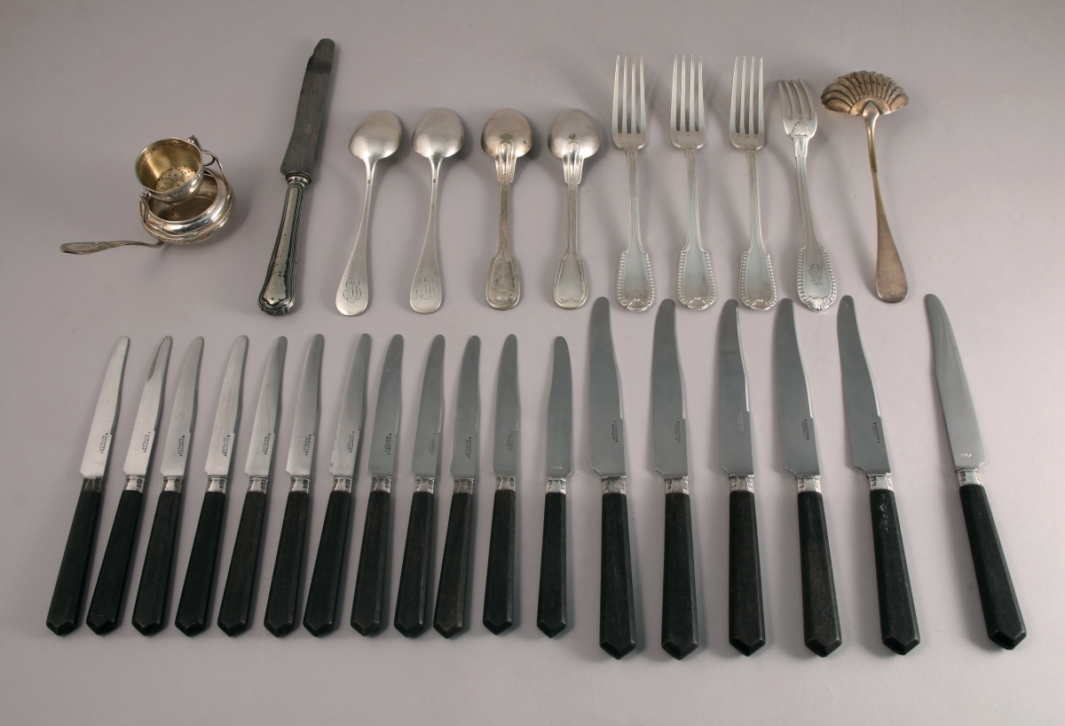 MÉTAL ARGENTÉ, 30 PIÈCES: suite de SIX COUTEAUX et 12 COUTEAUX À ENTREMETS, manche en bois noirci et virole géométrisante de style Art Déco; PINCE À SUCRE; CUILLÈRE À SAUPOUDRER; PASSE-THÉ; QUATRE FOURCHETTES; QUATRE CUILLÈRES à entremets; COUTEAU.