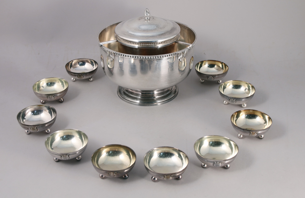 - SEAU À CAVIAR en métal argenté. La bordure du seau à glace à décor d'un rais perles ponctué de quatre larges feuilles d'acanthe. Il repose sur un piédouche. Le réceptacle à caviar couvert est orné d'un rais de perles et présente un fretel en graine feuillagée. Il repose sur une structure à trois bras. Style XVIIIe, XXe. Haut. 14,5, Diam. 22,5 cm.