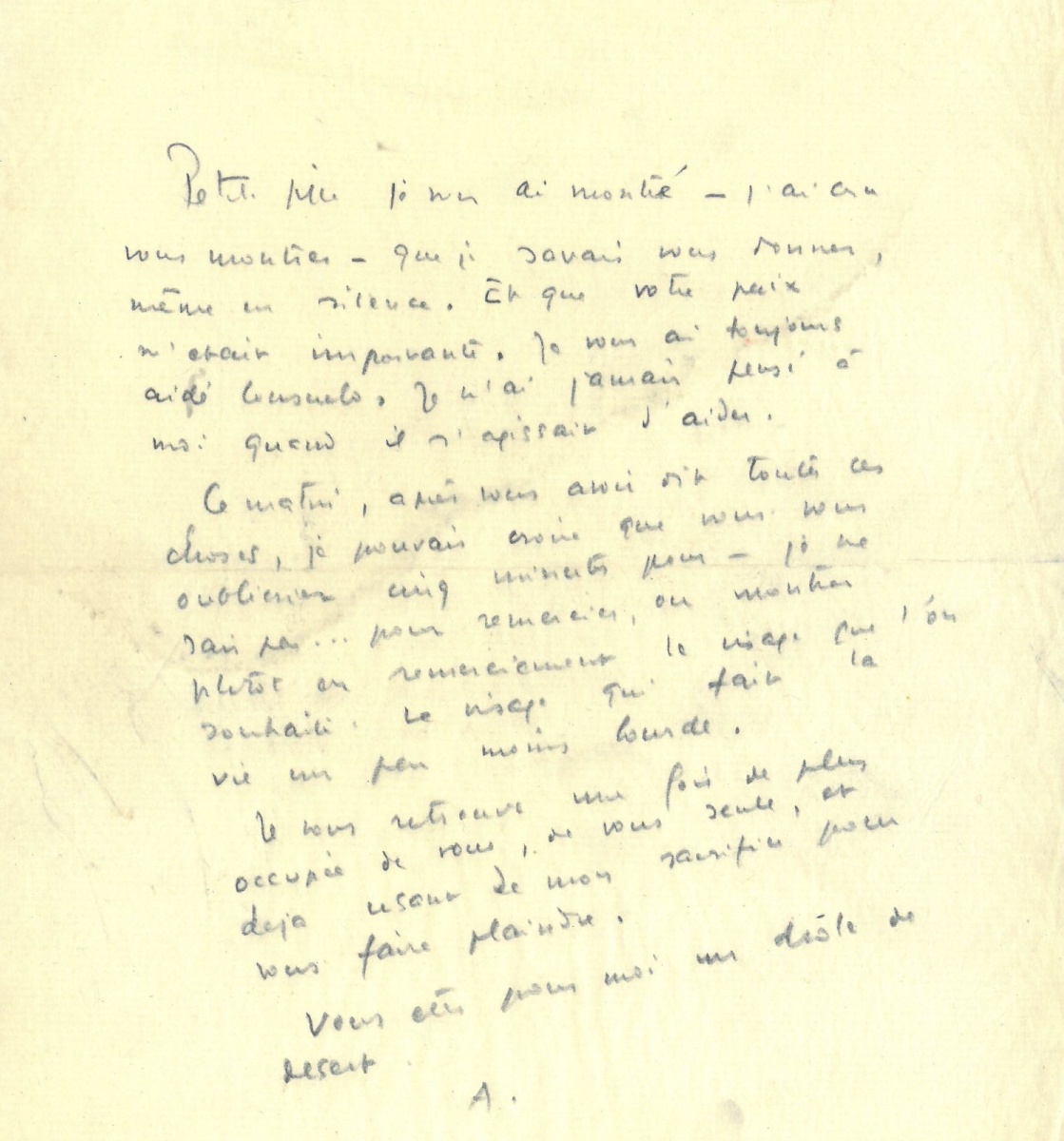 " Petite fille je vous ai montré - j'ai cru vous montrer - que je savais vous donner, même en silence. Et que votre paix m'était importante. Je vous ai toujours aidé Consuelo. Je n'ai jamais pensé à moi quand il s'agissait d'aider. Ce matin, après vous avoir dit toutes ces choses, je pouvais croire que vous vous oublieriez cinq minutes pour - je ne sais pas… pour remercier, ou montrer plutôt en remerciement le visage que l'on souhaite. Le visage qui fait la vie un peu moins lourde. Je vous retrouve une fois de plus occupée de vous, de vous seule, et déjà usant de mon sacrifice pour vous faire plaindre. Vous êtes pour moi un drôle de désert ".