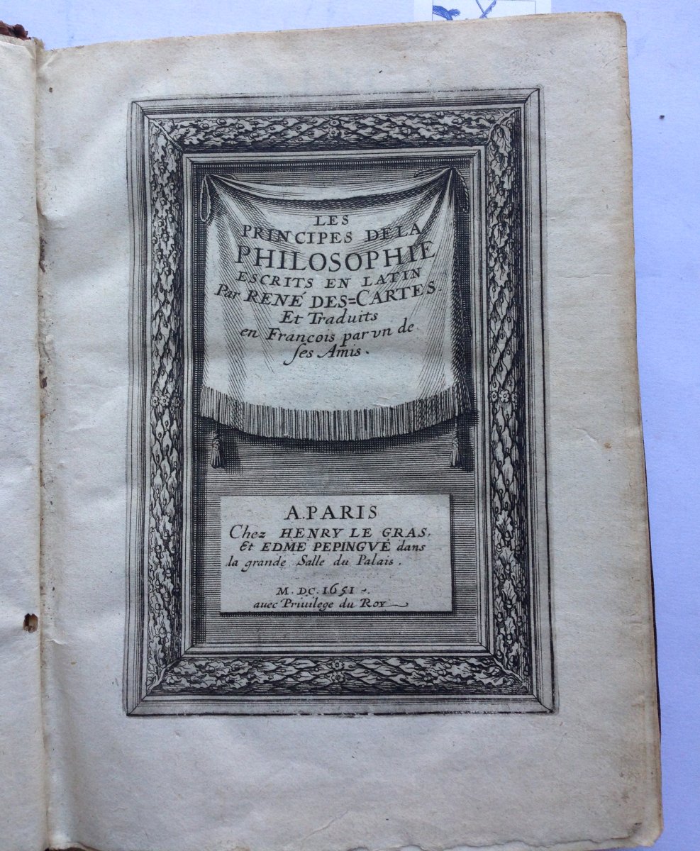 Edition originale de la traduction française (de Picot ou Clerselier?) La date en chiffres romains (MDCXLVII) du faux-titre gravé a été partiellement grattée et remplacée par la date de 1651 en chiffres arabes (ce qui donne: MDC1651) -sans doute pour faciliter une remise en vente.