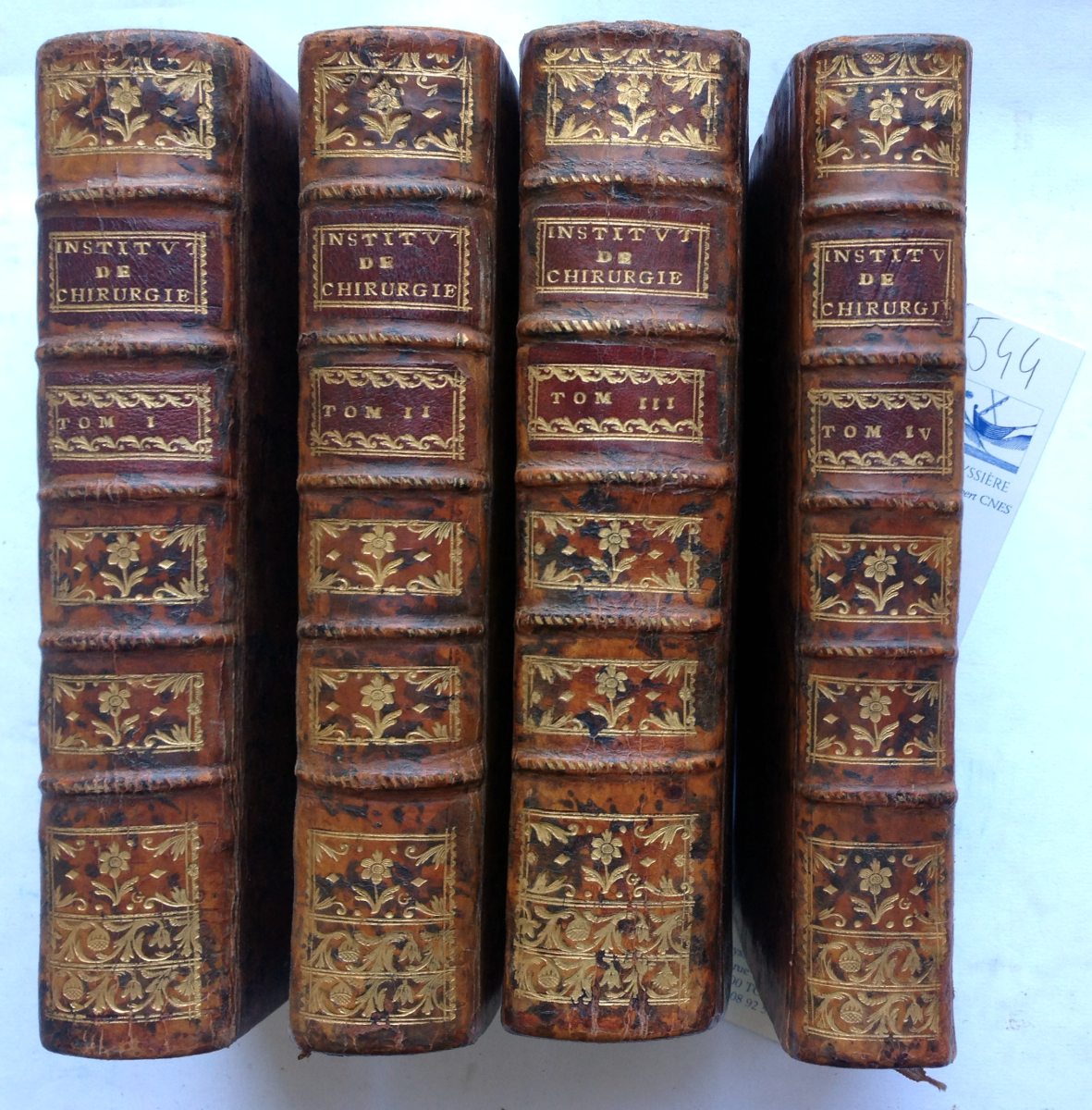 4 volumes in-8. 24 pages, LXXVI pages pour la "Bibliothèque de chirurgie", 515 pages, (5 ff). 676 pages et (3 ff). 782 pages et (4 ff). 480 pages et (32 feuillets). Tranches mouchetées. Plein veau raciné du temps. (Galerie de ver dans la marge intérieure d'environ 300 pages du Tome III, affectant quelques lettres.)